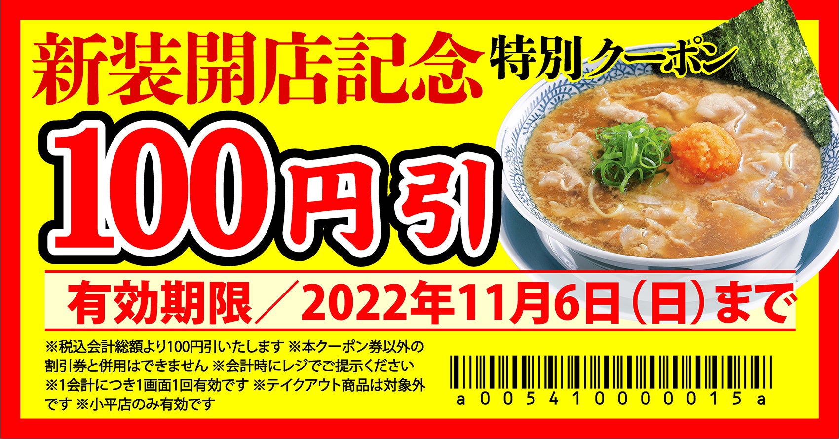 リニューアル記念として、2022年11⽉6⽇(日)まで『丸源ラーメン 小平店』のみでご利⽤いただける100円引クーポンを配布します。