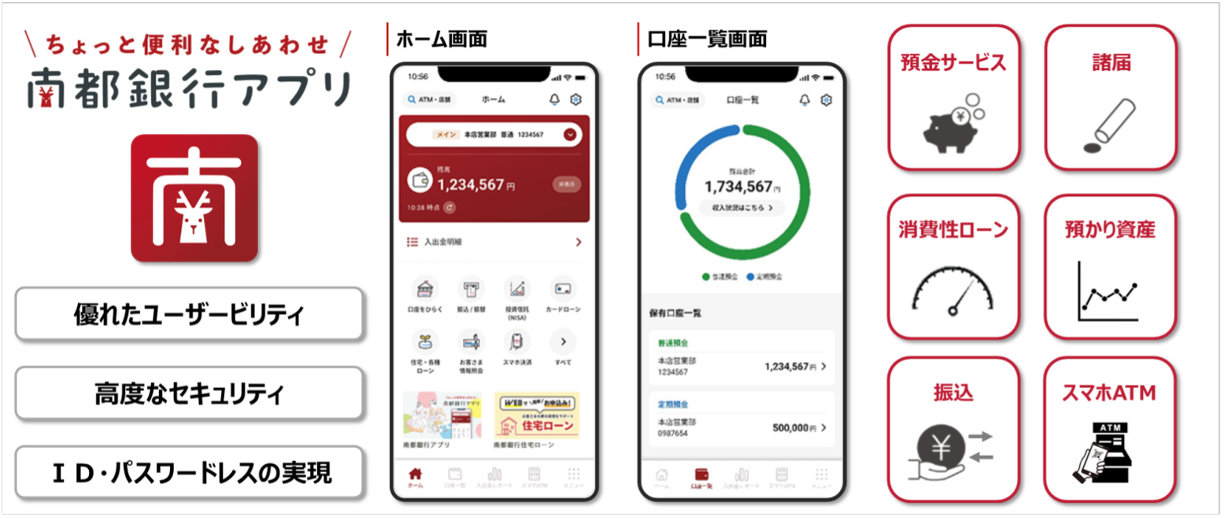 「南都銀行アプリ」は、お客さまの生活スタイルの変化や多様化するニーズに応えるべく、スマートフォンからロケーションフリーで銀行窓口と同様のサービスを快適かつ安全にご利用いただけるバンキングアプリです。シンプルかつ直感的なデザインとしたほか、生体認証を活用したFIDO認証※1に加えて、地方銀行では初となるLIQUID Auth Face認証※2等、最先端のセキュリティ導入によりID・パスワードレスを実現するなど、デジタルテクノロジーを駆使して優れたユーザビリティと高いセキュリティを両立させたサービスとなっています。