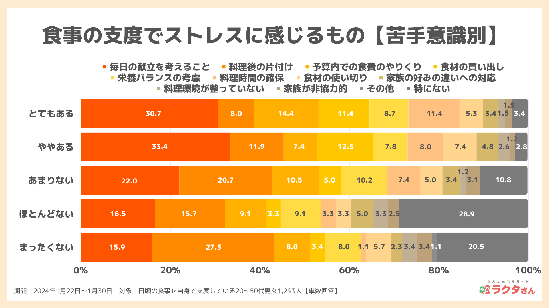 健康のために栄養バランスを考慮したり、おかずのバリエーションを意識するなど、忙しい生活の中で毎日考えなければいけないことが、ストレスに感じることの要因として挙げられます。