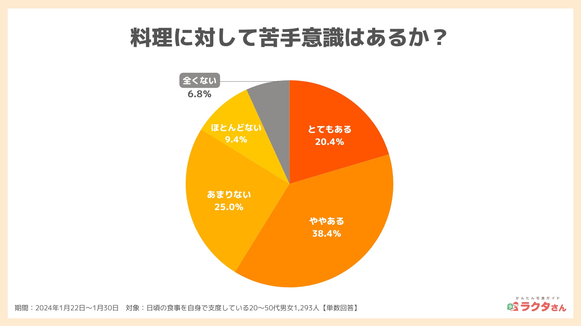 【料理に関する意識調査】約6割が苦手意識あり、最もストレスに感じるのは「毎日の献立を考えること」(かんたん宅食ガイド ラクタさん調べ)
