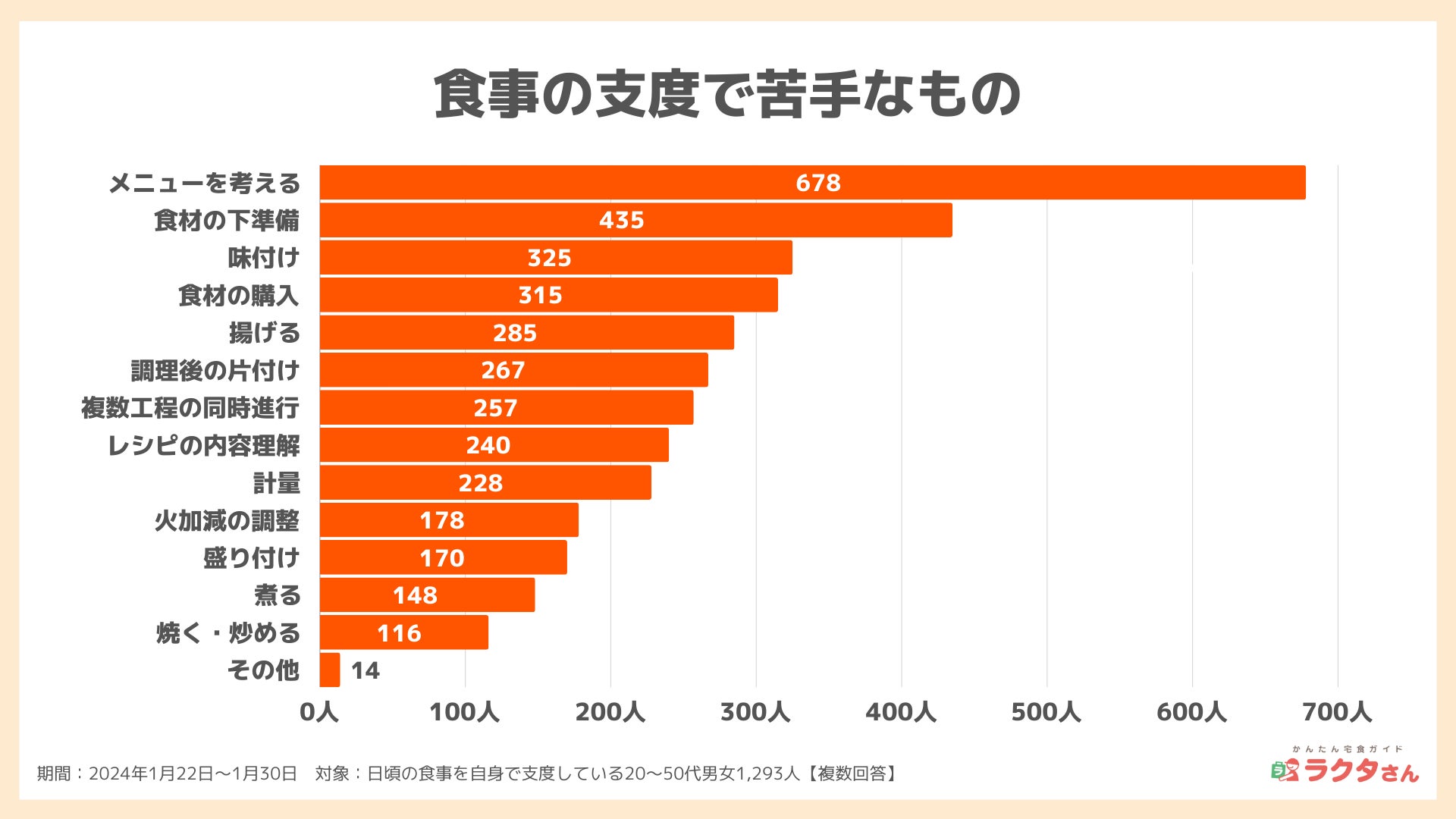全体の過半数にあたる678人が、その日の食事のメニューを考えることに苦手意識を持っている結果でした。