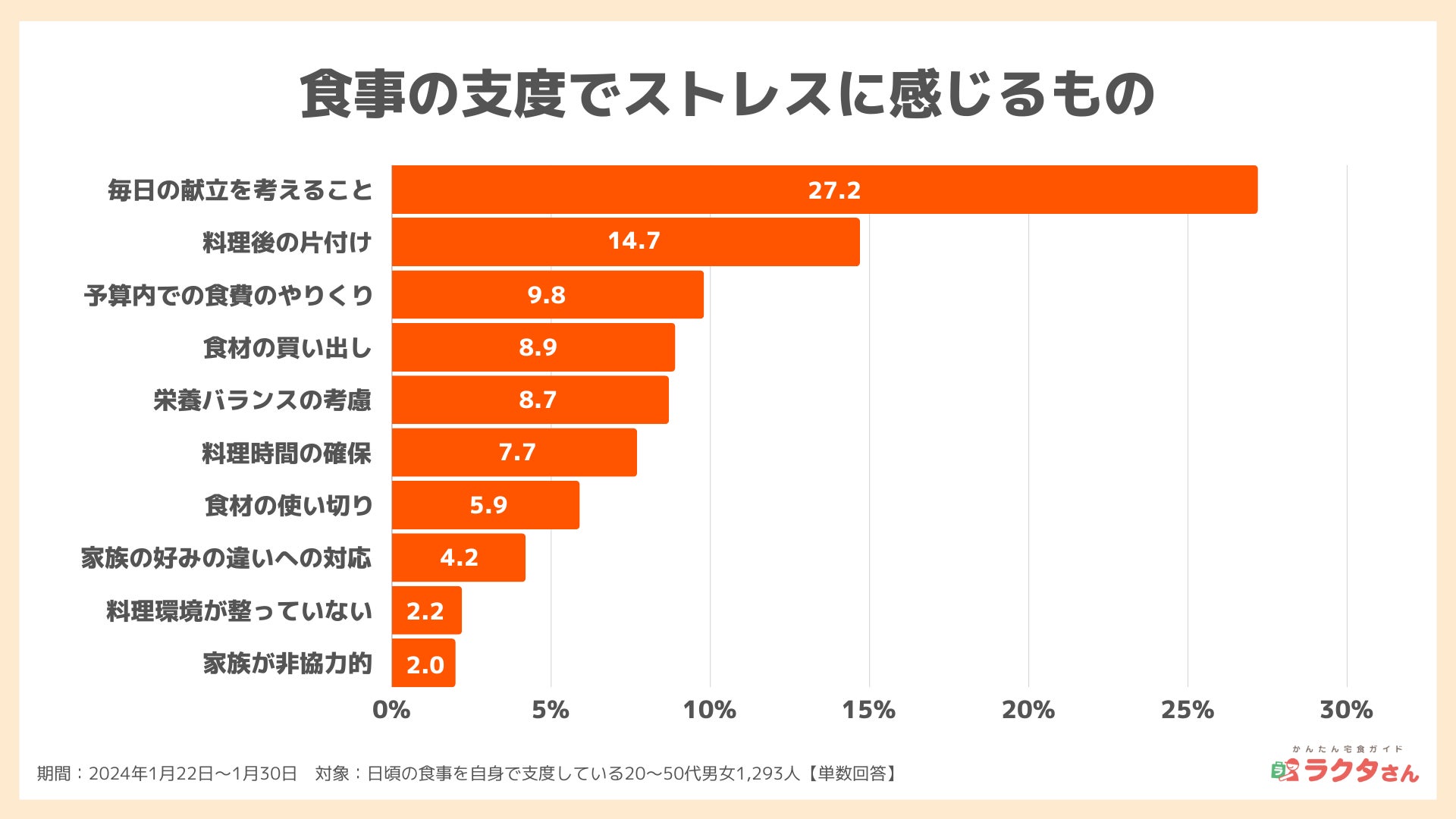 食事の支度において最もストレスに感じてるものを聞いてみると、「毎日の献立を考えること(27.2%)」が最も多く、次いで「料理後の片付け(14.7%)」、「予算内での食費のやりくり(9.8%)」でした。