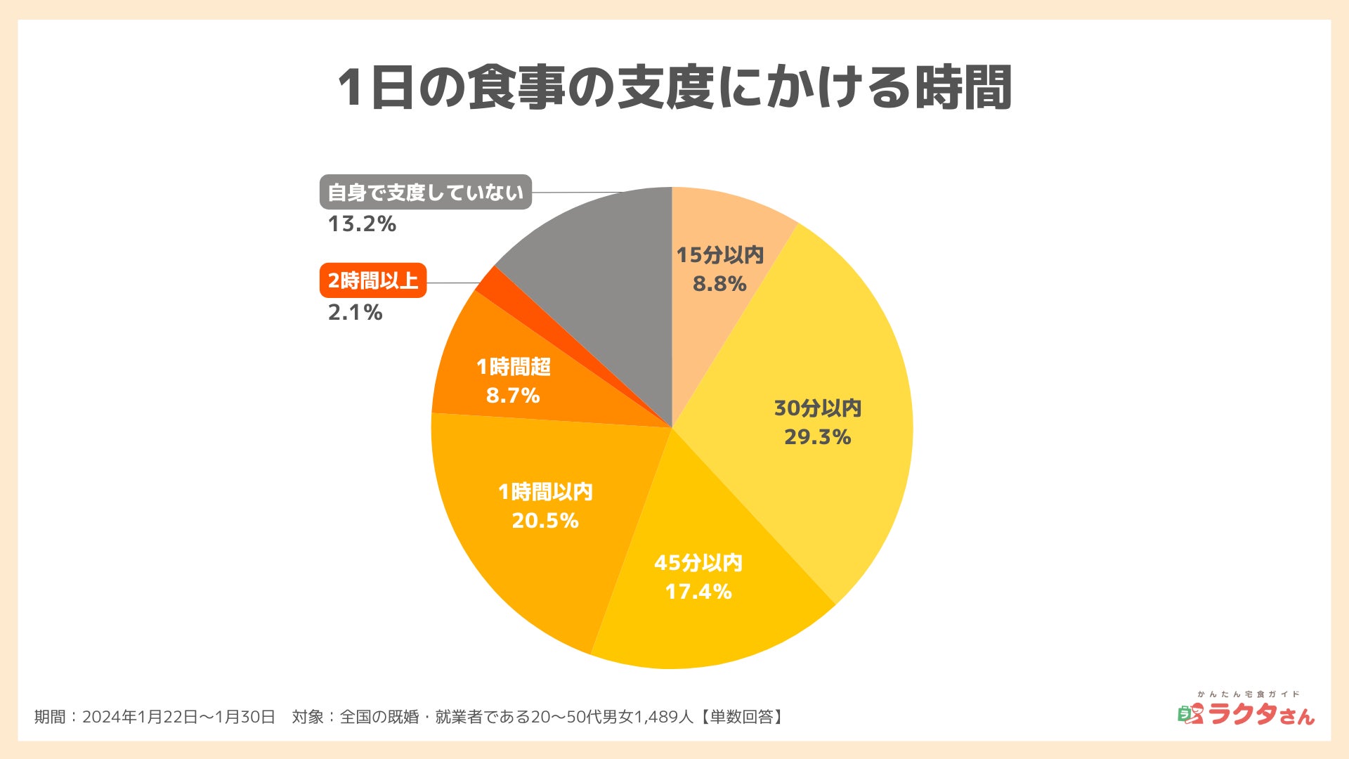 1日あたりの食事の支度にかけている時間を聞いてみると、最も多いのは「30分以内(29.3%)」、次いで「1時間以内(20.5%)」、「45分以内(17.4%)」でした。