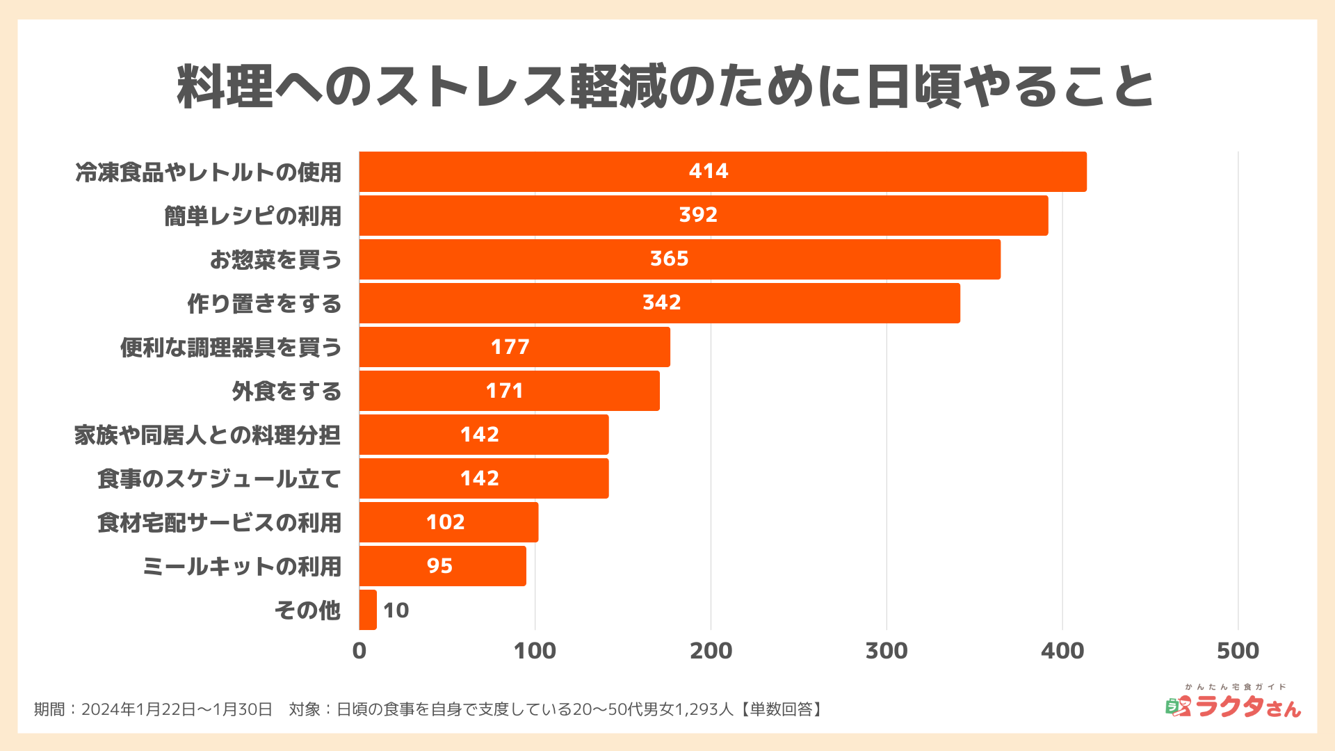 食事の支度においてストレスを感じている人が、ストレス軽減のために日頃やっていることで最も多いのは、「冷凍食品やレトルトの使用(414人)」、次いで「簡単レシピの利用(392人)」、「お惣菜を買う(365人)」という結果でした。