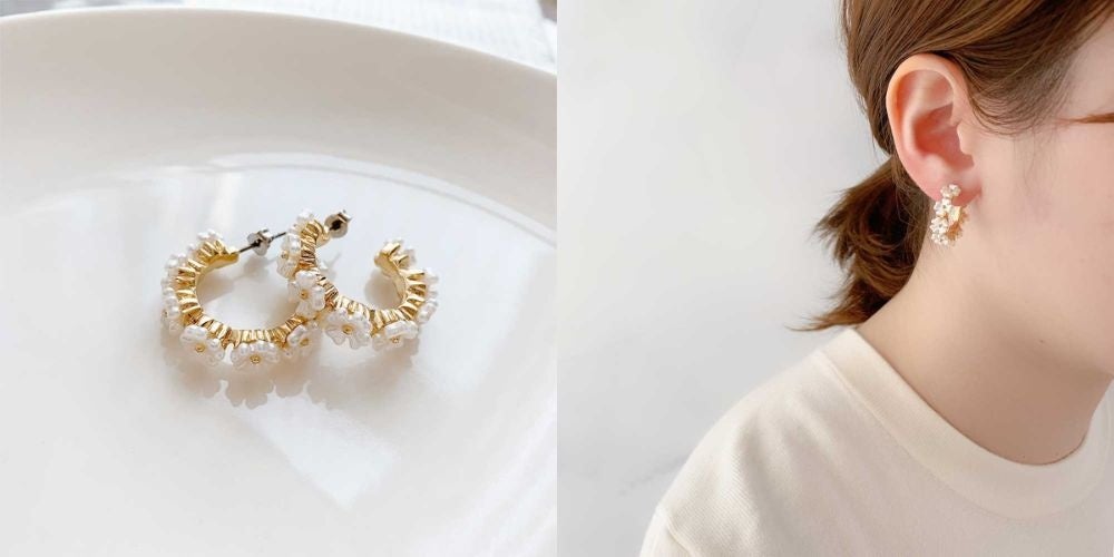 控えめなサイズ感ながらも、パールのフラワーをあしらった華やかで可愛らしいフープピアス。