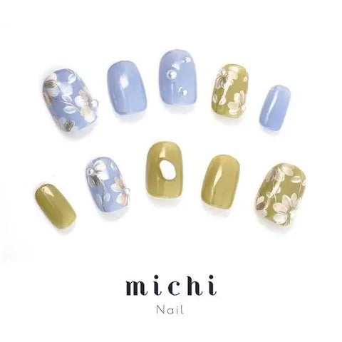 落ち着きのあるブルーとグリーンカラーに繊細な花のアートが美しいネイルです。上品さと華やかさを兼ね備えたデザインで、季節問わずに楽しめるネイルチップです。