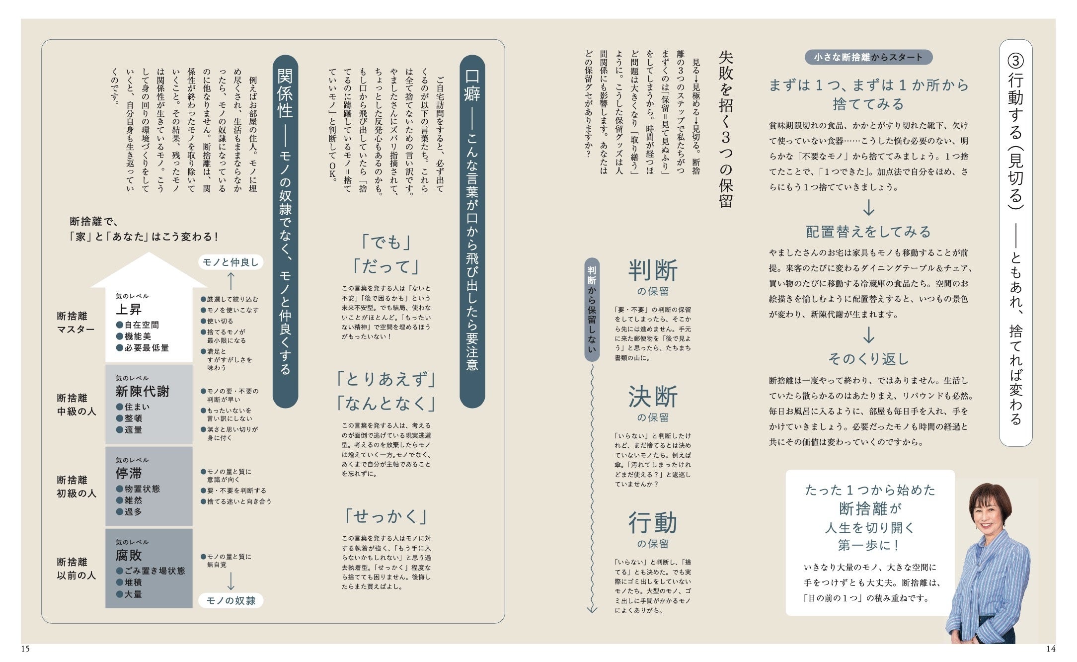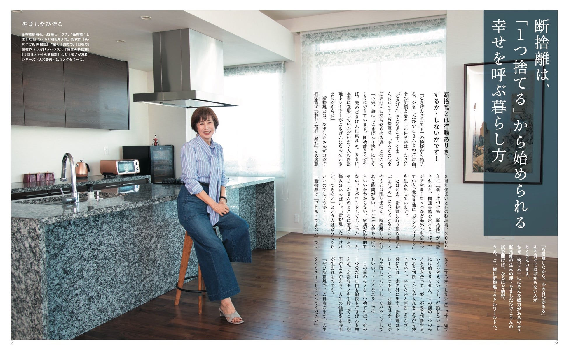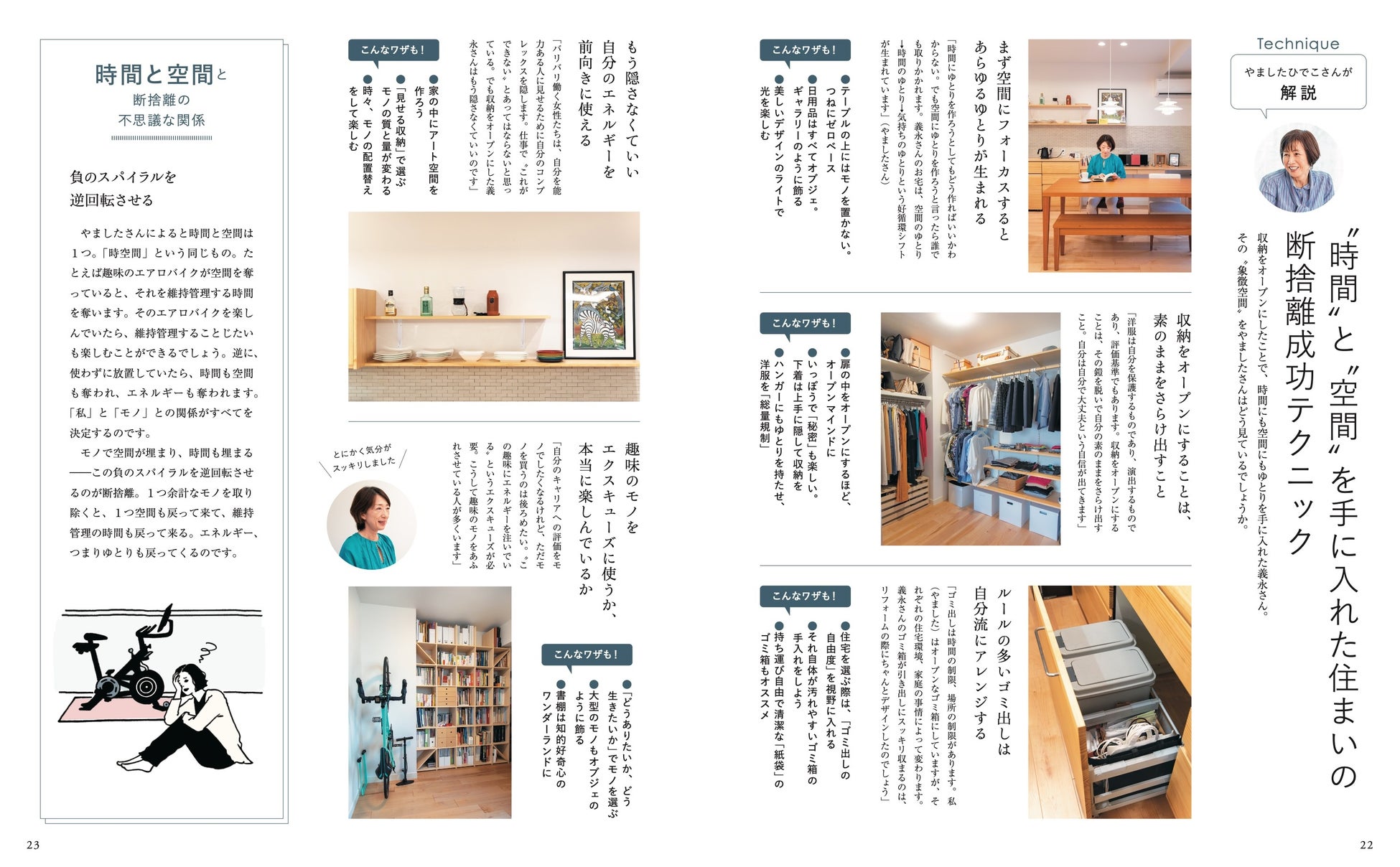 断捨離へのこだわり、断捨離上級者ならではの断捨離成功テクニックを紹介。さらには断捨離を始めたきっかけ、それまでの暮らし、断捨離を始めて訪れた変化、断捨離が呼び起こした思わぬ奇跡まで……。 断捨離によって激変した、それぞれの人生の物語が紐解かれます。 巻頭では、やましたさんのご自宅でのインタビューを収録。
