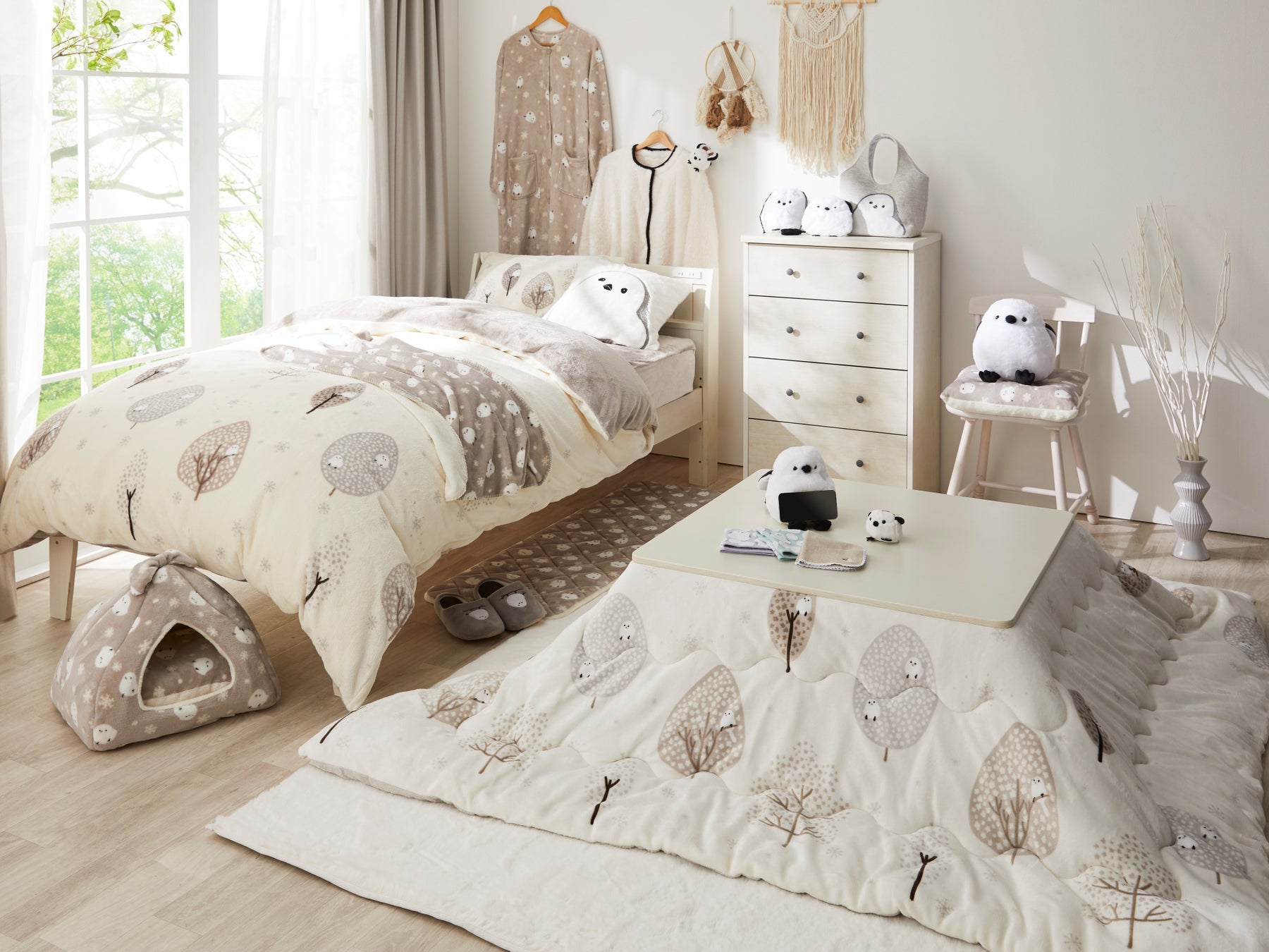 デコホームでは寝具カバー・こたつ布団・スリッパ・クッションなど全27種類のシマエナガグッズを販売中。そのうち、あったかアイテムとしておすすめのこたつ布団や着る毛布などは、10月初旬から販売を開始した新商品です。キョトンとした表情が愛くるしいシマエナガグッズを取り入れて、冬らしい、可愛いお部屋を作ってみませんか。