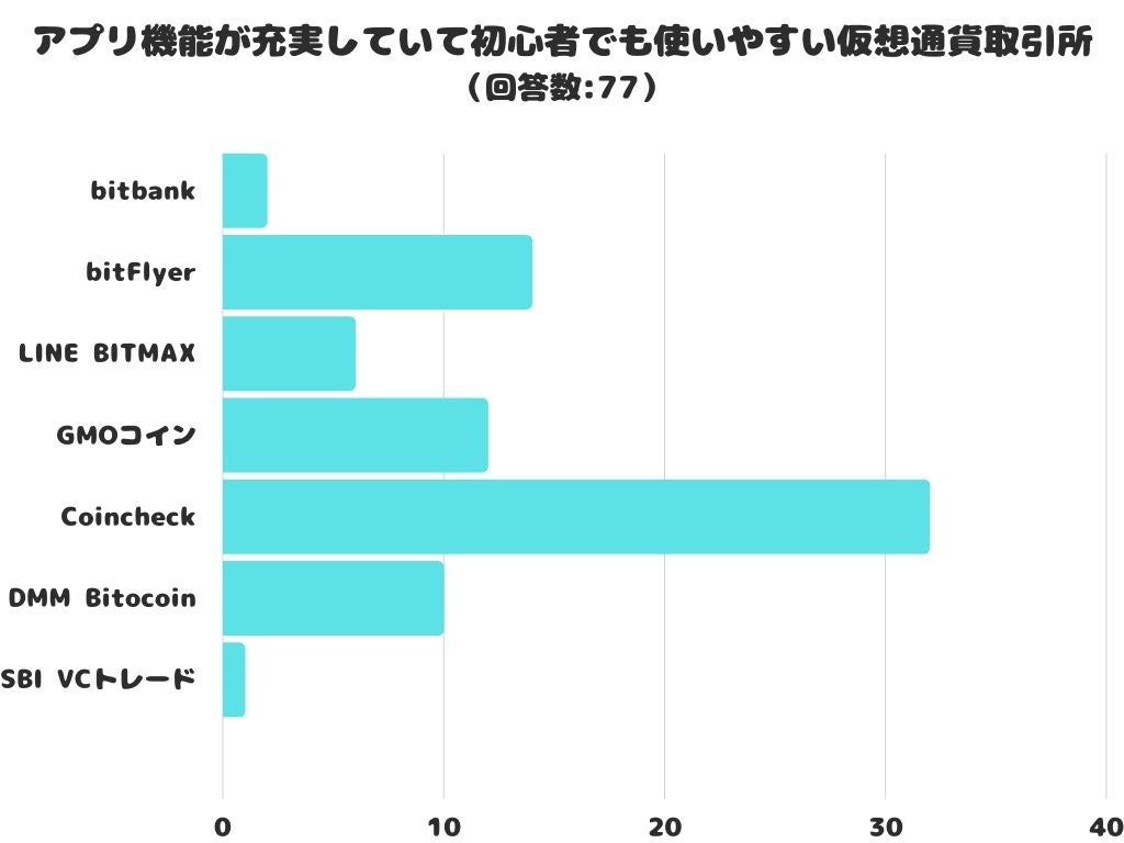 アプリ機能が充実していて初心者でも使いやすい仮想通貨のおすすめ取引所をアンケートにて調査したところ、1位は「Coincheck」でした。