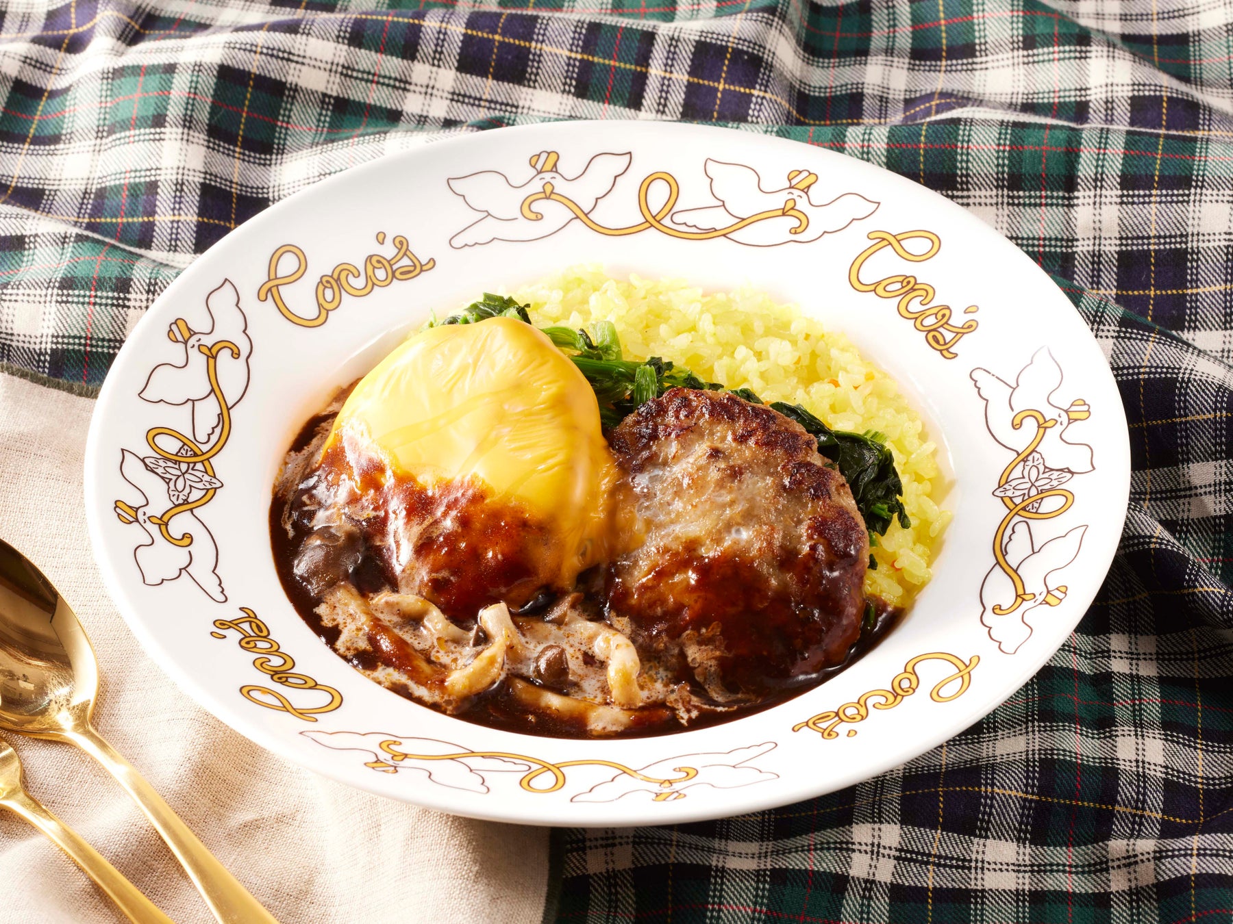 ターメリックライスに濃厚なデミグラスソースをあわせ、チーズハンバーグとジューシーなハンバーグを贅沢にトッピングしました。