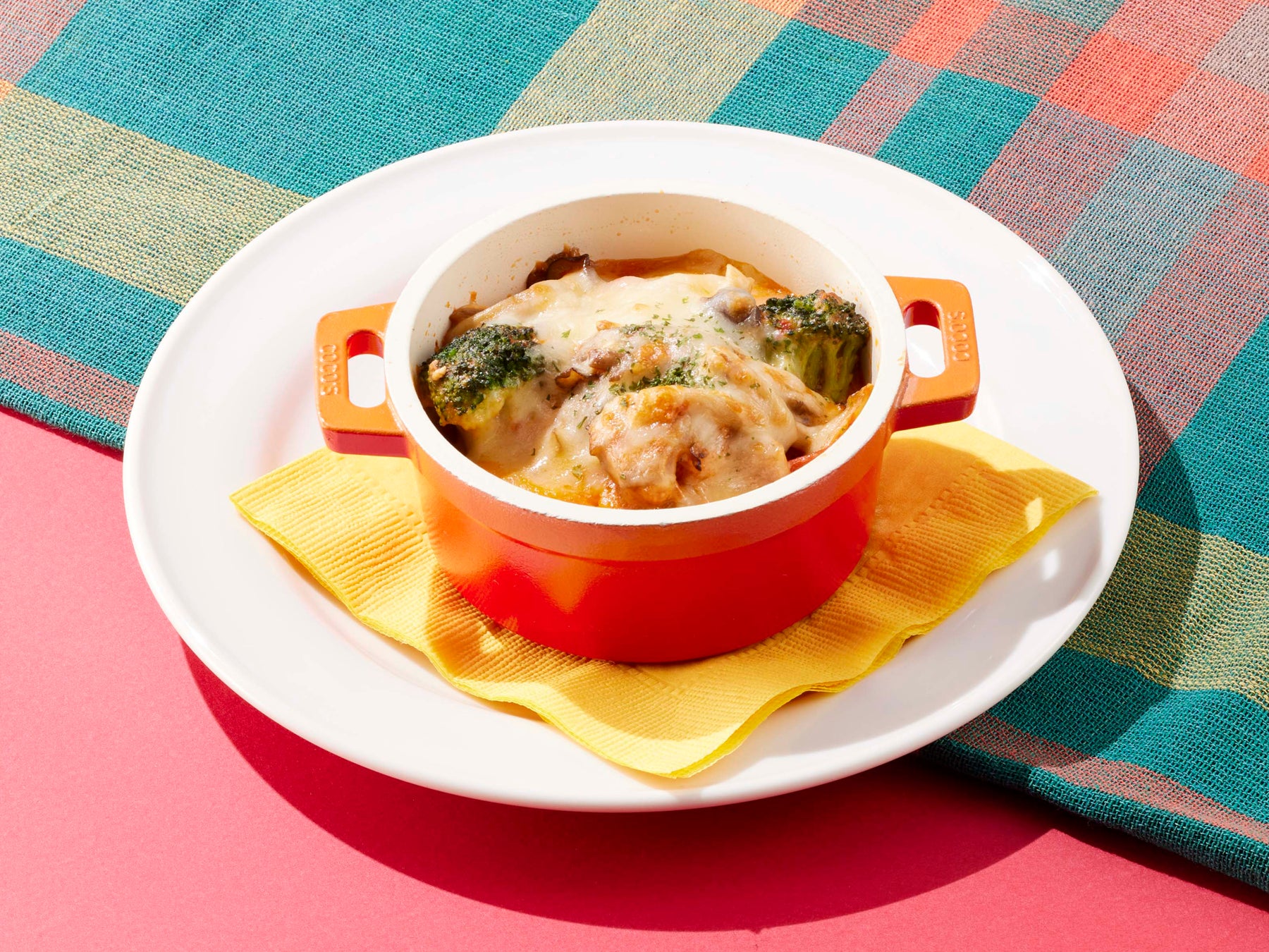 チキンや舞茸、しめじ、ブロッコリーが入ったトマトクリームソースのココットグラタンです。