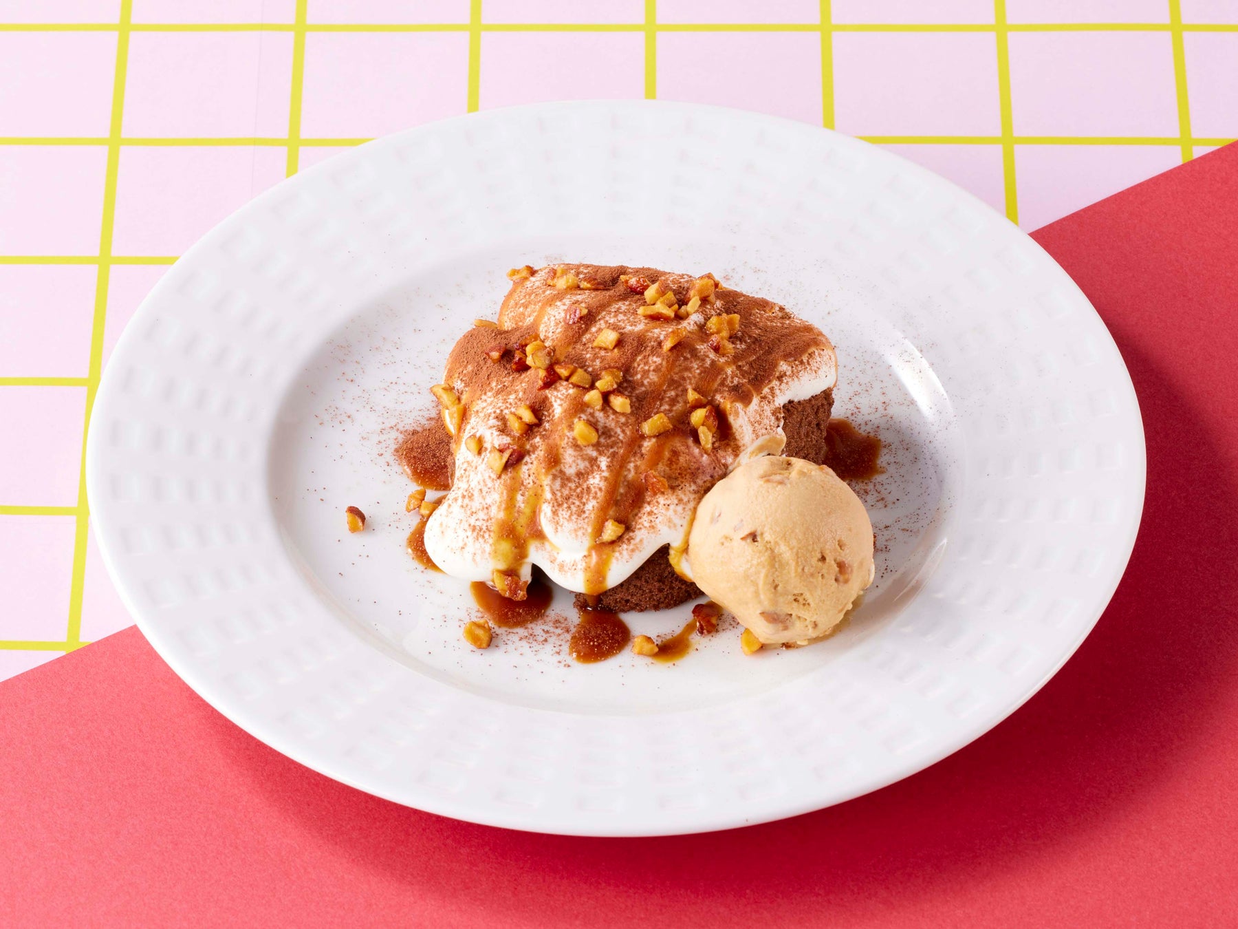 ふわっととろけるようなくちどけのホイップと軽い口当たりのチョコケーキがやみつきになる一皿です。カリカリとしたキャンディングアーモンドが食感にアクセントをプラス。濃厚なキャラメルソースのコクや、塩キャラメルアイスの程よい塩味と甘さが味わいに奥行きを与えます。