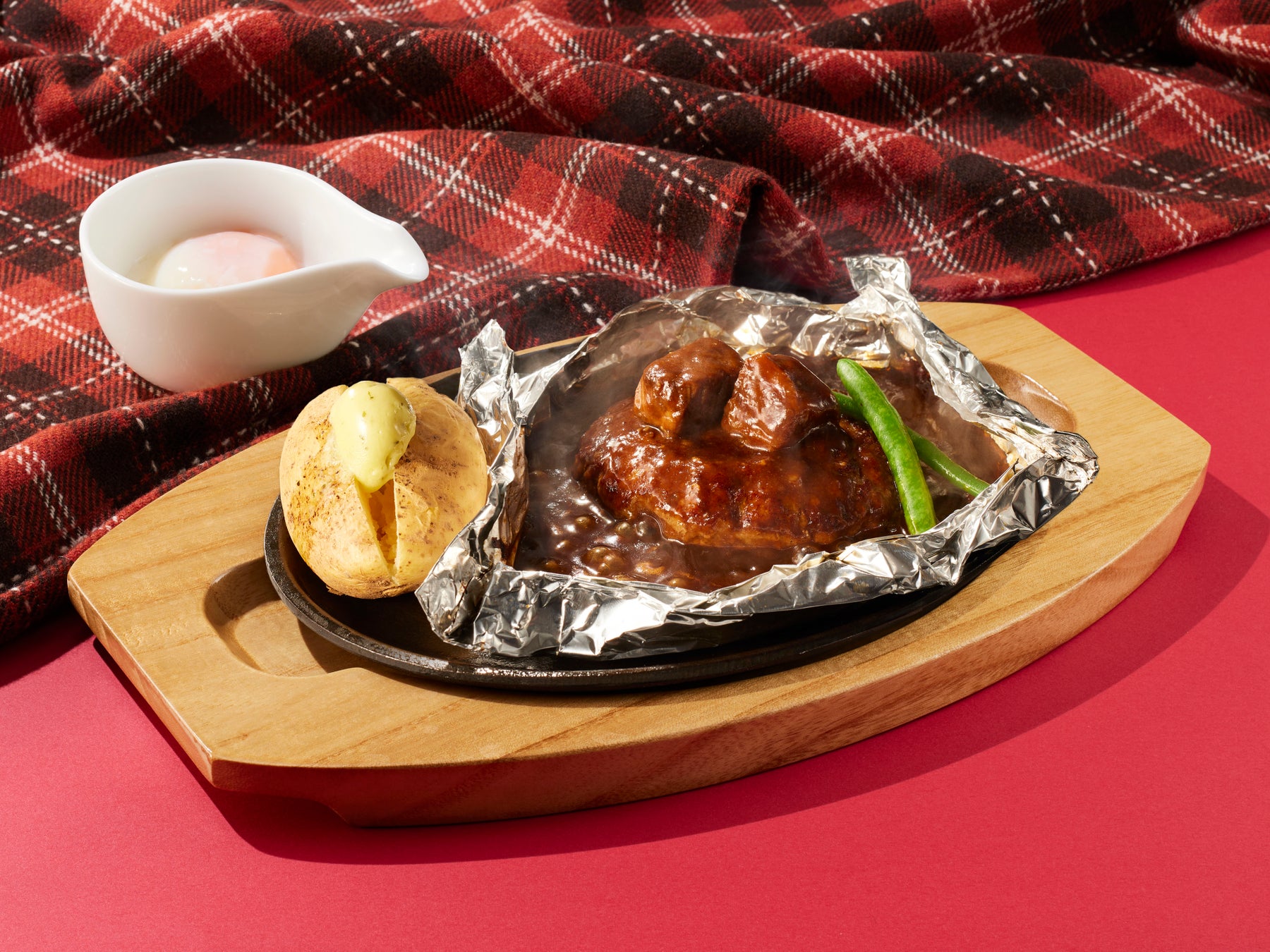 “ハンバーグ×玉子”のまさに王道な組み合わせを楽しめるメニューが登場です。じっくり煮込んだとろっとろのビーフと肉汁たっぷりのハンバーグにまろやかな温泉玉子が絡み、より濃厚な味わいをお楽しみいただけます。