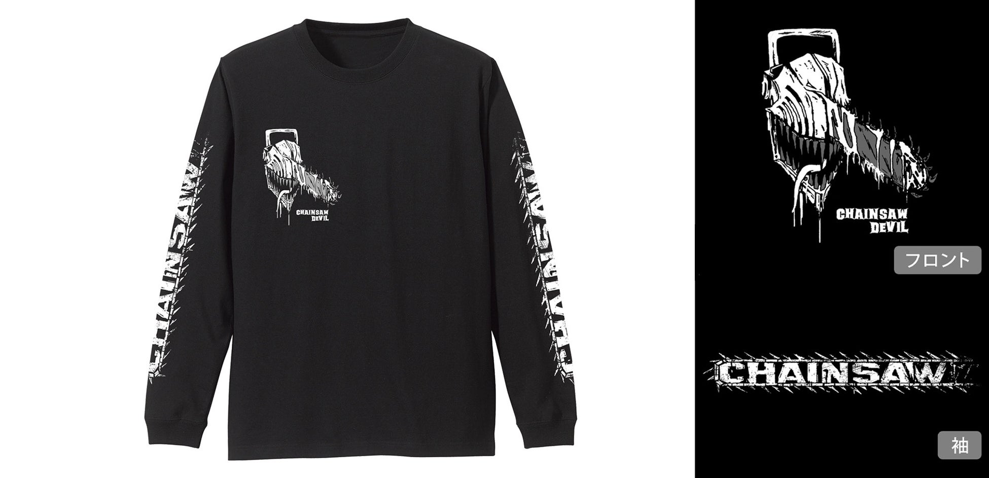 | 商品名 チェンソーマン 袖リブロングスリーブTシャツ 発売日 2023年10月上旬 価格 4,290円(税込) サイズ:S/M/L/XL 素材:綿100% 両手に宿るチェンソーが魅力!チェンソーマンになった気分で街へ出かけよう! |