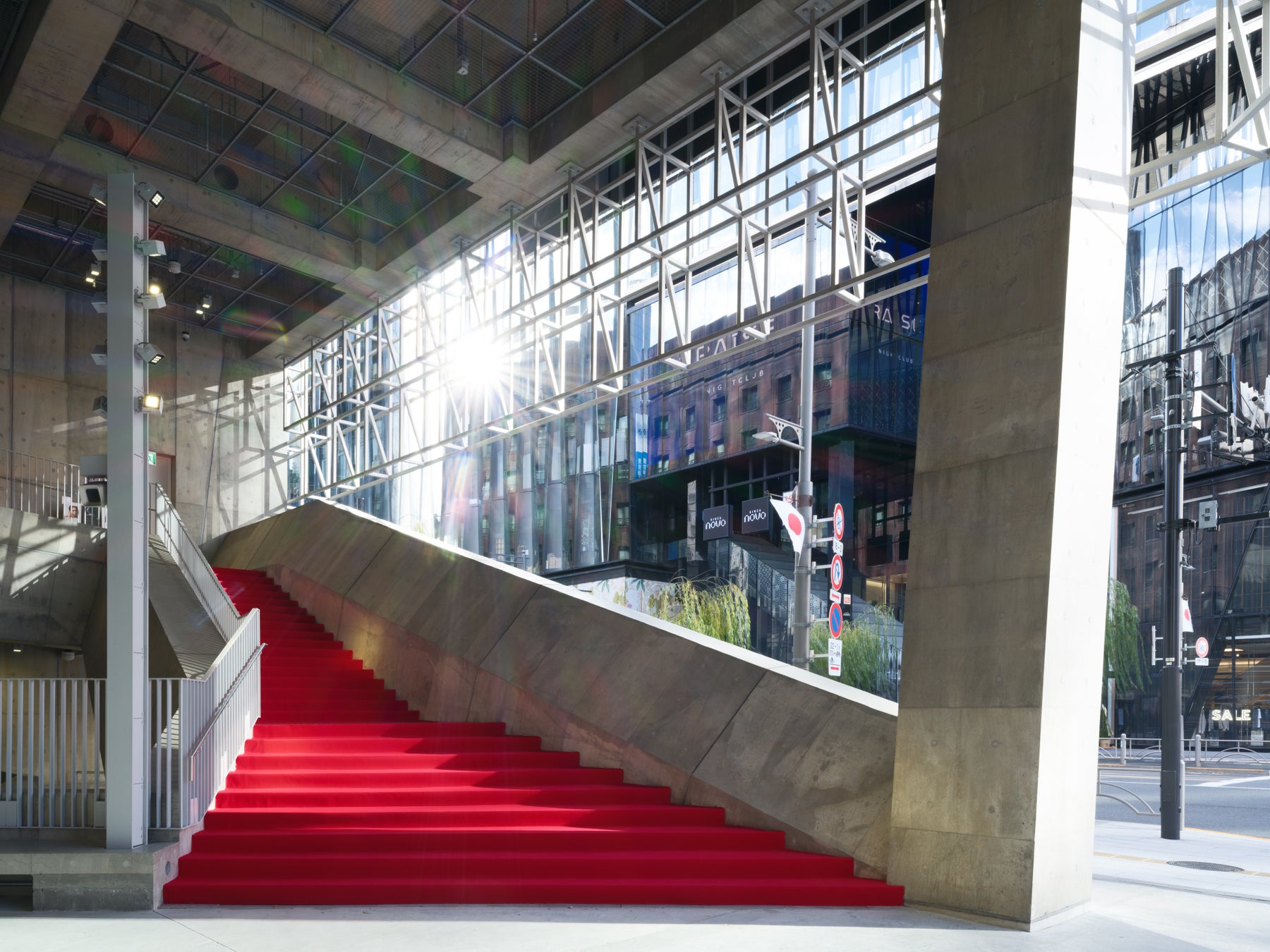 地下4階・地上5階の特徴的な建築は、あえて銀座の標準的なビルの半分ほどの高さに抑え、街に空間的な余白とリズムをもたらしています。地上は三方が通りに開かれ、地下鉄や地下駐車場とも直結。さらに、地下1階から地上2階へと広がる大きな吹き抜け構造や縦のプロムナードが、街とのシームレスな繋がりをより都会的で立体的なものにしています。