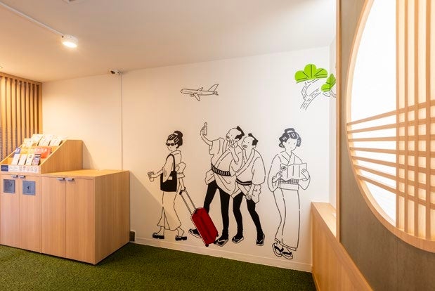 足を踏み入れると、日本情緒漂う暖簾や提灯がお出迎え。和室をイメージした室内は畳風の椅子や縁台などを置き、温かな光や木のぬくもりが落ち着くしつらえとなっています。壁には江戸小町を想起させるような和装の人物や動物などのイラストが描かれており、フォトスポットとしても最適です。また、観光をよりお楽しみいただけるよう、都内各所や新宿の情報を随時ご用意して参ります。
