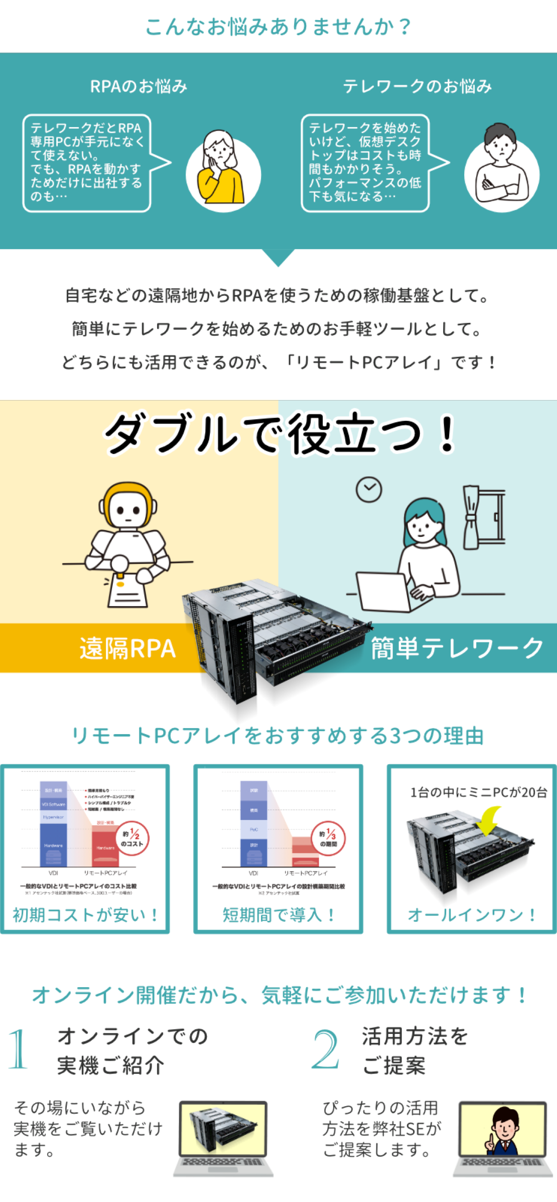 | 対象 | ●テレワーク環境についてお悩みの方 ●テレワーク中のRPA稼働にお悩みの方 |