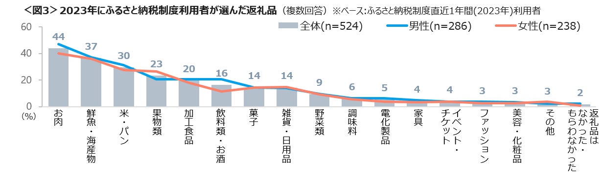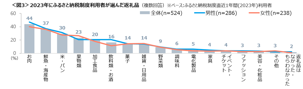 2023年にふるさと納税制度を利用した人が選んだ返礼品は、「お肉」「鮮魚・海産物」「米・パン」が多い。「お肉」「飲料類・お菓子」は男性で、「果物類」は女性での人気が高い。<図3>