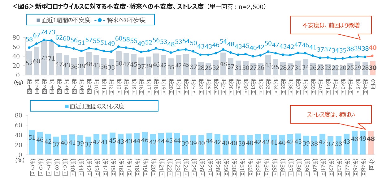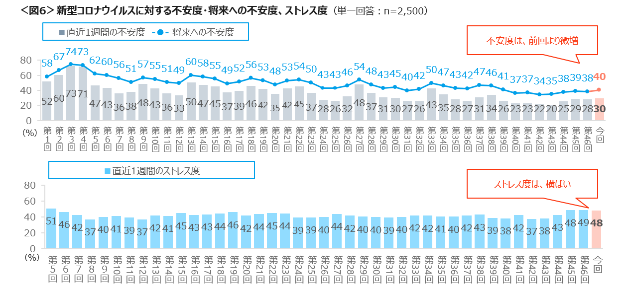 定点指標の「直近1週間の不安度」は微増の30%、「将来に対する不安度」も微増の40%。「直近1週間のストレス度」は横ばいの48%であり、不安度、ストレス度ともに10月の結果と大きな変わりはない。<図6>