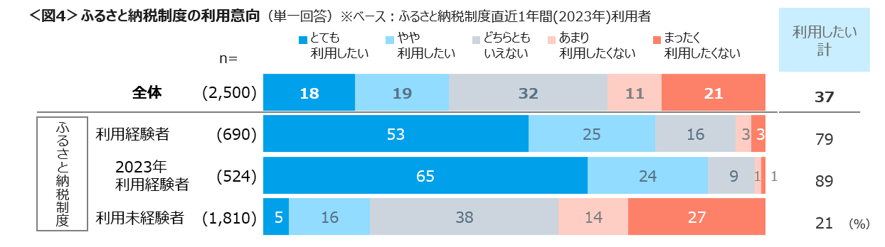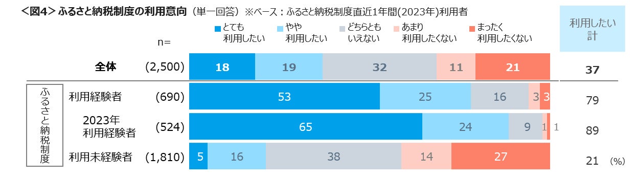 今後のふるさと納税利用意向は、全体で37%。特に2023年の利用経験者では89%と極めて高い意向があり、制度を利用したことをきっかけとしてリピーターとなっている姿が見て取れる。<図4>能登半島地震の災害があったことから、今後は、返礼品を受け取らないふるさと納税制度の利用者が増えることも考えられる。