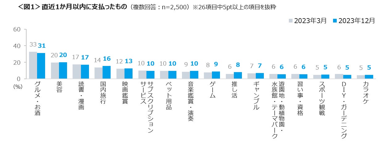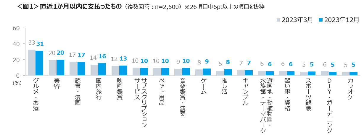 直近1か月間の支出は、「グルメ・お酒」「美容」「読書・漫画」がTOP3にあがる。2023年3月よりやや上昇したものは「国内旅行」とイベント参加やグッズ購入などの「推し活」。<図1>