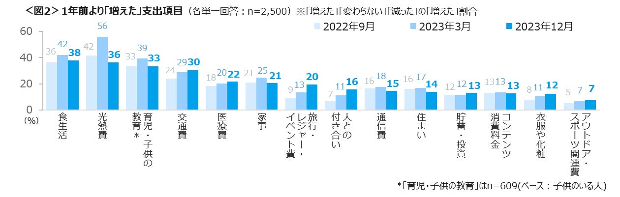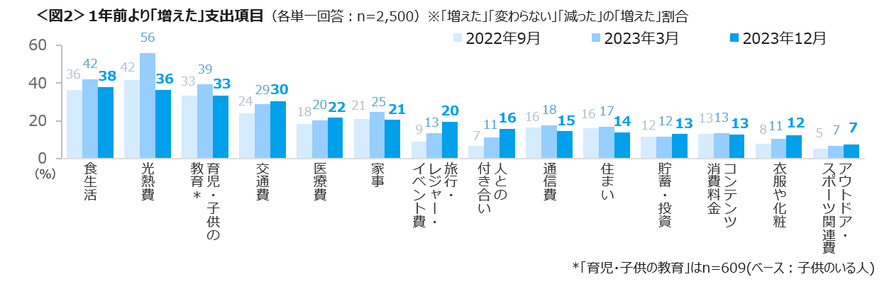 1年前と比較し”支出が増えた”項目は「食生活」「光熱費」「育児・子供の教育」「交通費」が30%台と上位。「光熱費」は2023年3月よりは落ち着いてきている様子が見える。一方、「旅行・レジャー・イベント費」「人との付き合い」に関わる支出は、2022年9月より2倍以上の値となり、外出行動や人との交流への支出が堅調に回復している。<図2>