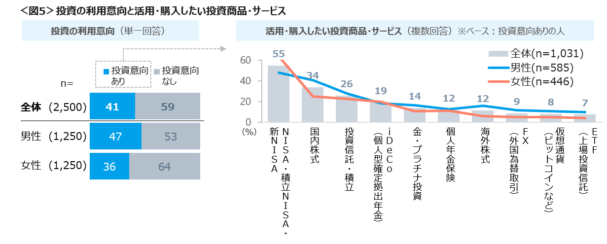 投資の利用意向は全体で41%、男性は47%と高い。投資意向者が活用・購入したい商品やサービスは「NISA・積立NISA・新NISA」が5割を超え、「国内株式」「投資信託・積立」「iDeCo(個人型確定拠出年金)」と続く。女性において「NISA・積立NISA・新NISA」のみ、活用・購入意向が男性より高い。<図5>