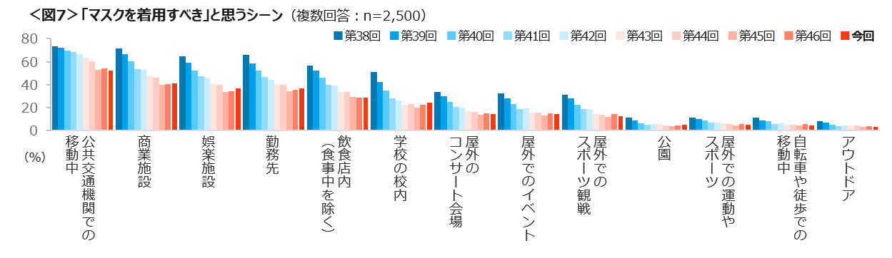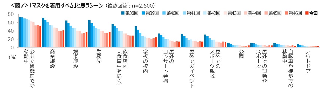 マスクを着用すべきシーンは、感染症が流行る時期でもあり、「娯楽施設」「勤務先」「学校の校内」などでのマスク着用意識が増加に転じた。<図7>