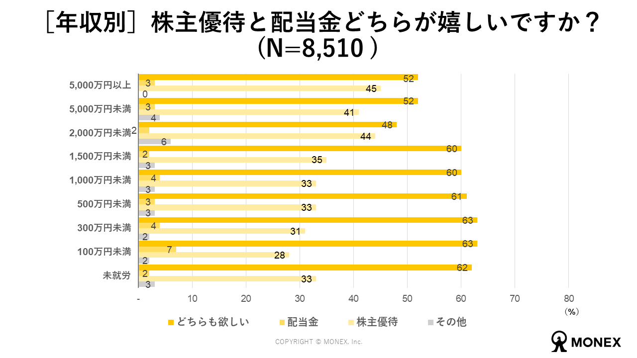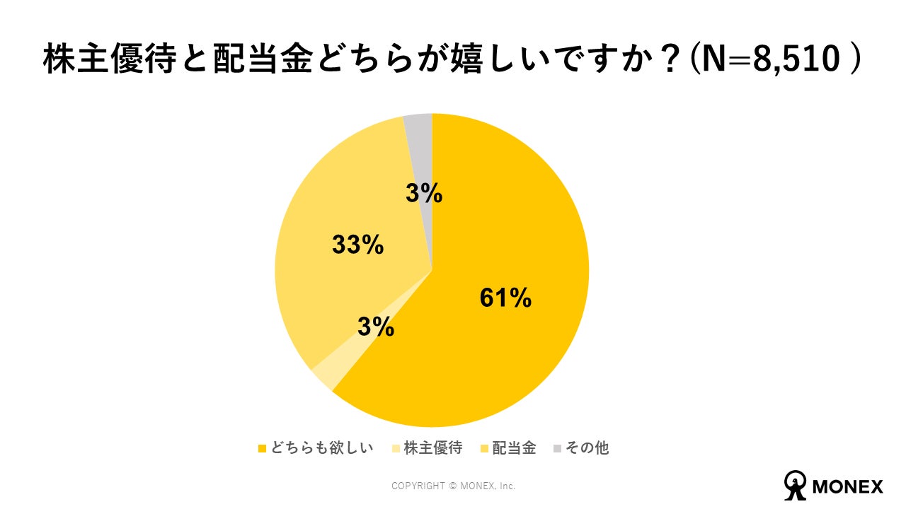 株主優待と配当金は「どちらも欲しい」という回答が61%でしたが、「配当金がいい」という投資家が33%と、「株主優待がいい」の3%を大きく引き離しました。収入が多くなるほど「どちらも欲しい」割合が少なくなり「配当金がいい」と回答する割合が高くなる傾向が見られます。株主優待はもらえる数量に上限があるため、株式を多く保有する場合は株主優待よりも、持ち株に応じて多く受け取れる配当金の方がありがたい、と認識されていることが明確に分かります。