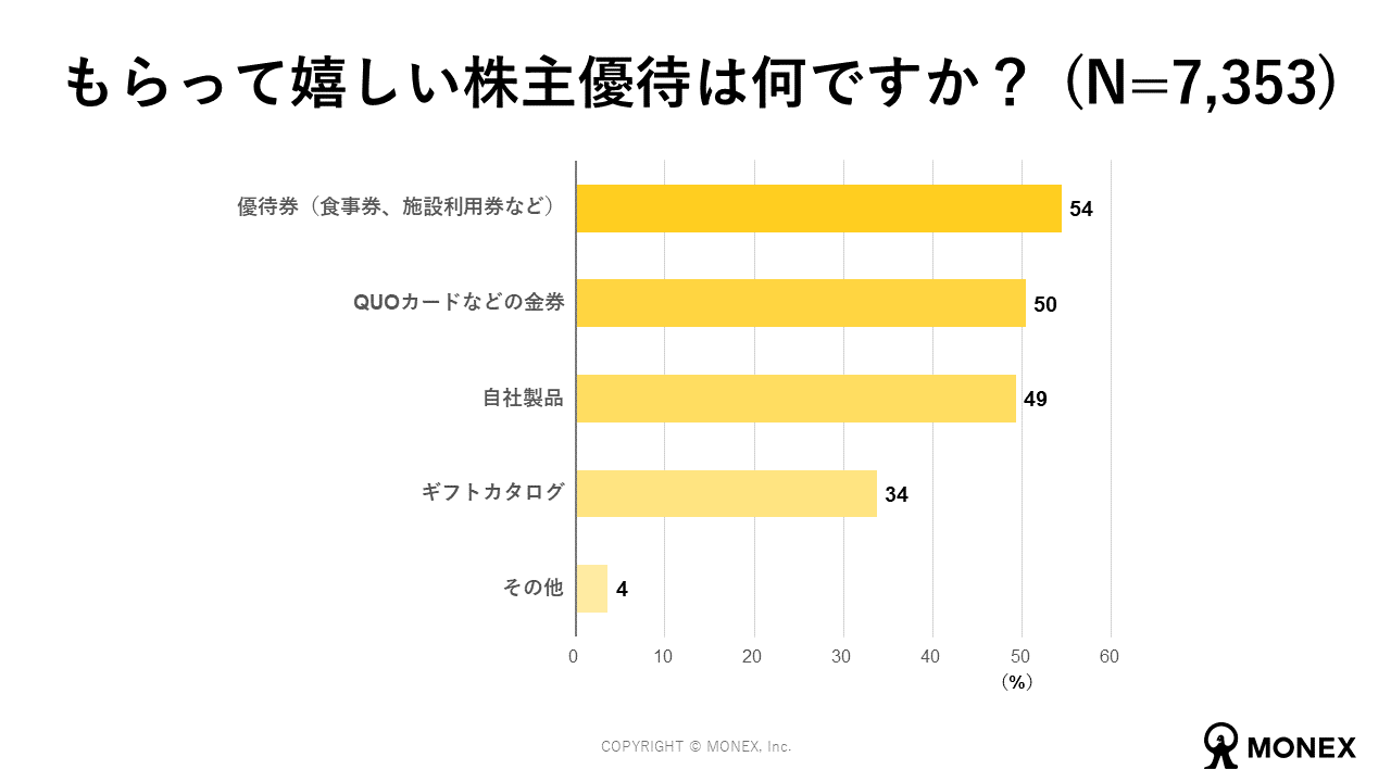 優待券がもらえることが半数以上の個人投資家が嬉しいと感じており、それに金券と自社製品が続く形となりました。これらの優待を期待して個別銘柄への投資が行われていることが伺えます。「もらって嬉しい株主優待がある銘柄しか買わない」、という個人投資家もおり、その他では、「企業の姿勢や気持ちが分かるもの」、「非売品プレゼント」、「米」などが多く挙がりました。