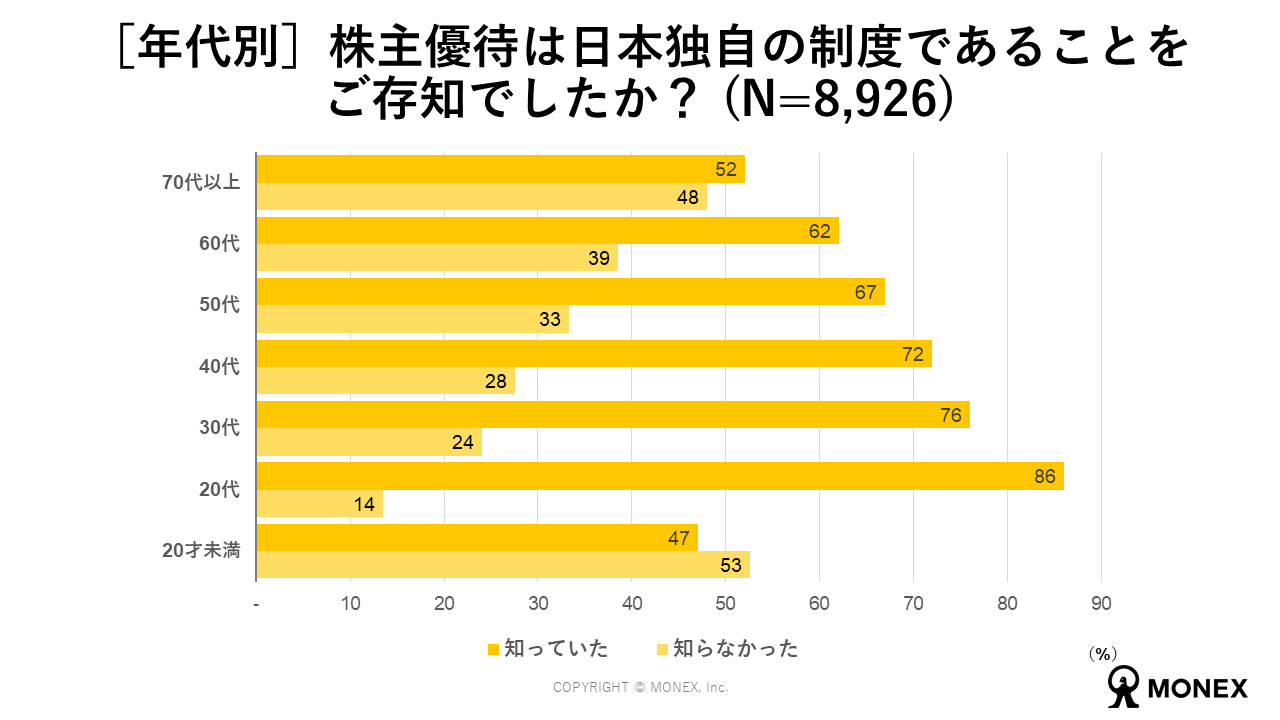 株主優待は日本独自の制度なのですが、40%近い個人投資家がその事実を知らないとうことが分かりました。しかし、20代では9割近く、3~40代も7割以上の個人投資家が日本独自の制度であることを知っており、年齢が低いほど株主優待が日本独自の制度であることの認知は高くなっています。米国株など、海外の個別株の取引平均年齢が日本株の個別株の取引平均年齢より低いため、若い投資家ほど株主優待が日本独自の制度であることを知っているのかもしれません。