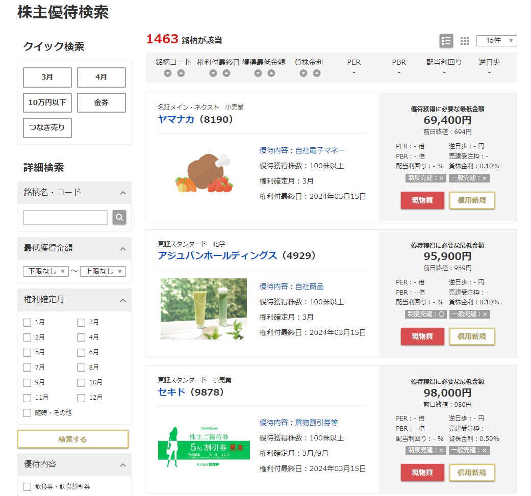 マネックス証券のウェブサイトには、株主優待の紹介ページがあります。株主優待の説明、注意事項、つなぎ売りや貸株サービスについての紹介も掲載しており、株主優待の検索ができるページもご用意しています。