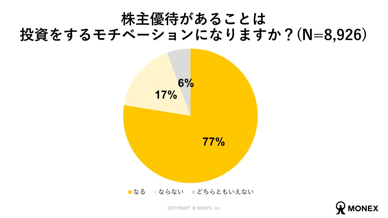 日本株の個別株を保有している投資家のうち、88%が株主優待がもらえる銘柄を保有しています。上場企業の約4割が株主優待を導入しているので、個別株保有者の90%近くが4割の企業のどこかに投資をしているという状況となっています。また、77%の投資家が「株主優待が投資のモチベーションになる」と回答しており、日本の個人投資家にとって、日本株への投資マインドの情勢には株主優待が大きく寄与していることが分かります。
