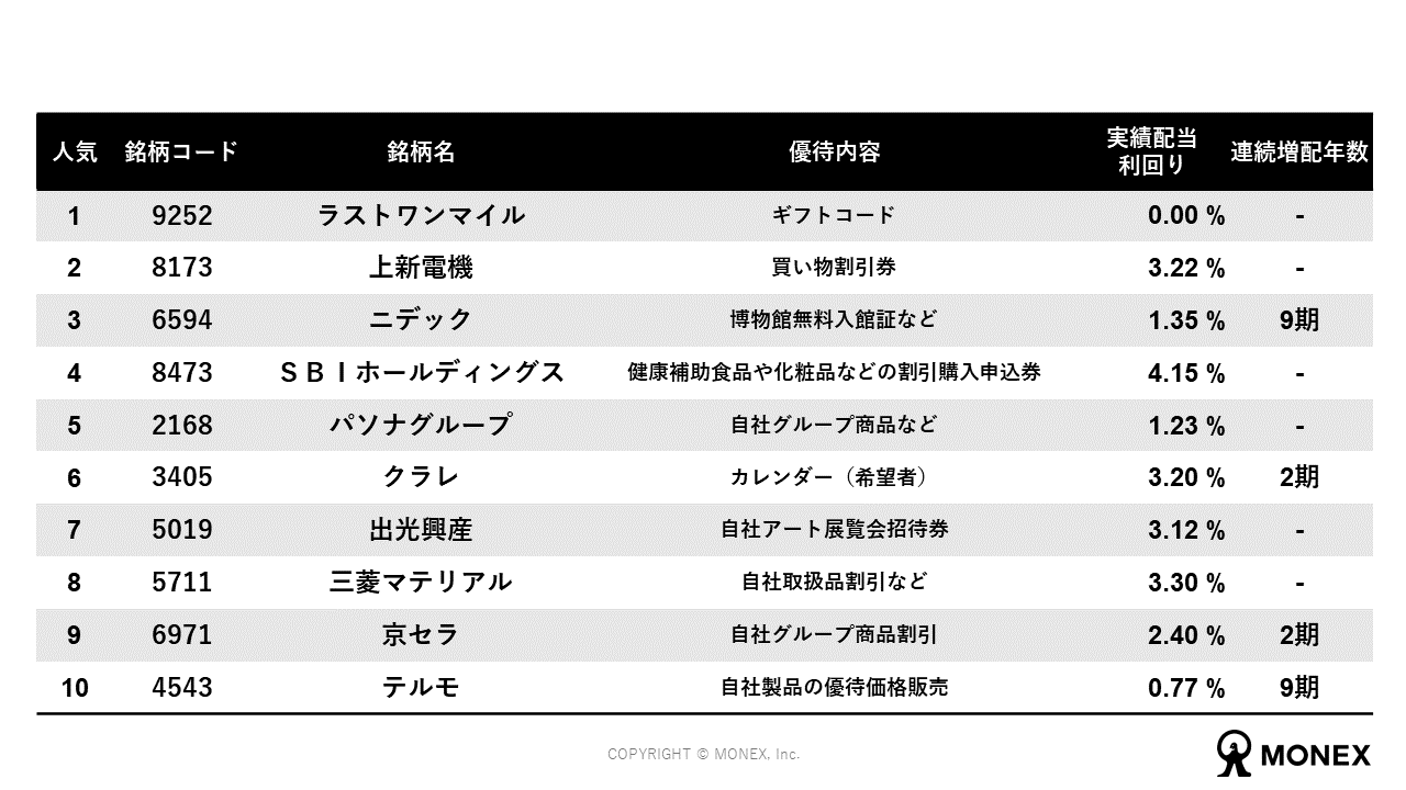 株主優待のある銘柄のランキングですが、2023年は株価が上昇した企業が目立ったこともあり、連続増配していたり配当利回りが高い銘柄が上位にランクインしました。