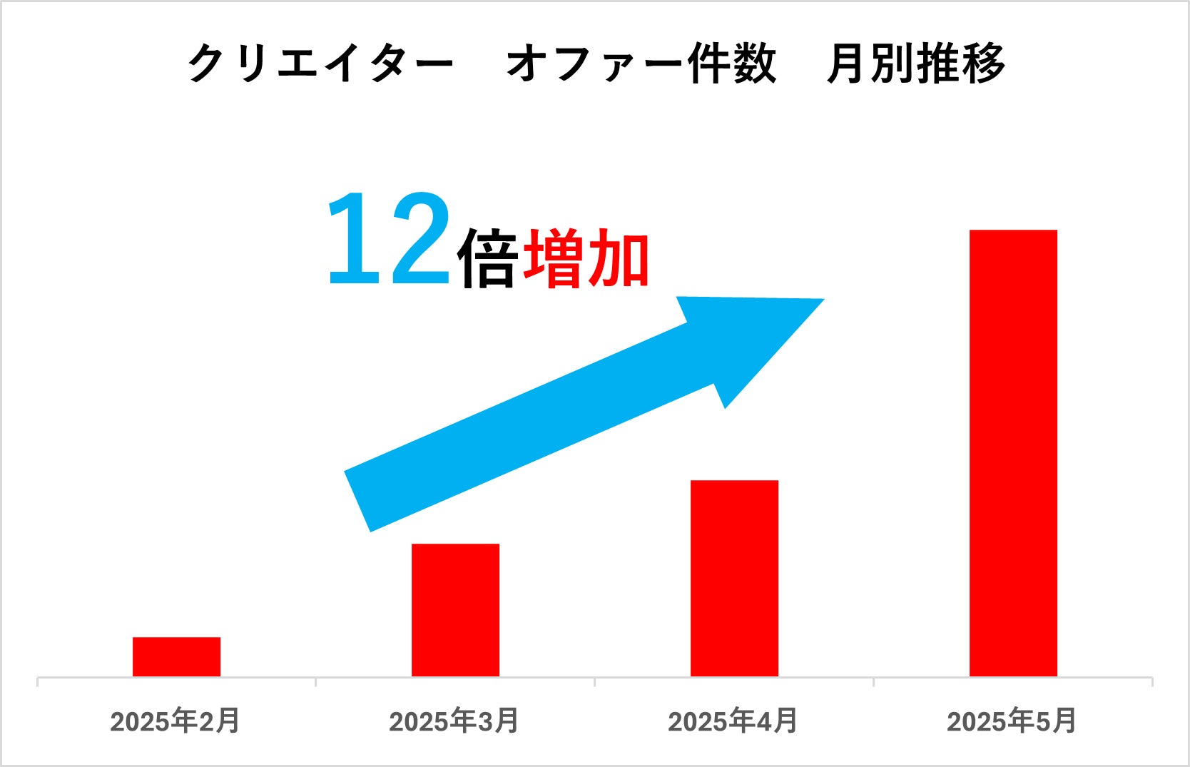 企業によるクリエイターへのオファー数は、2025年2月から2025年5月では12倍増加と破竹の勢いで成長しています。