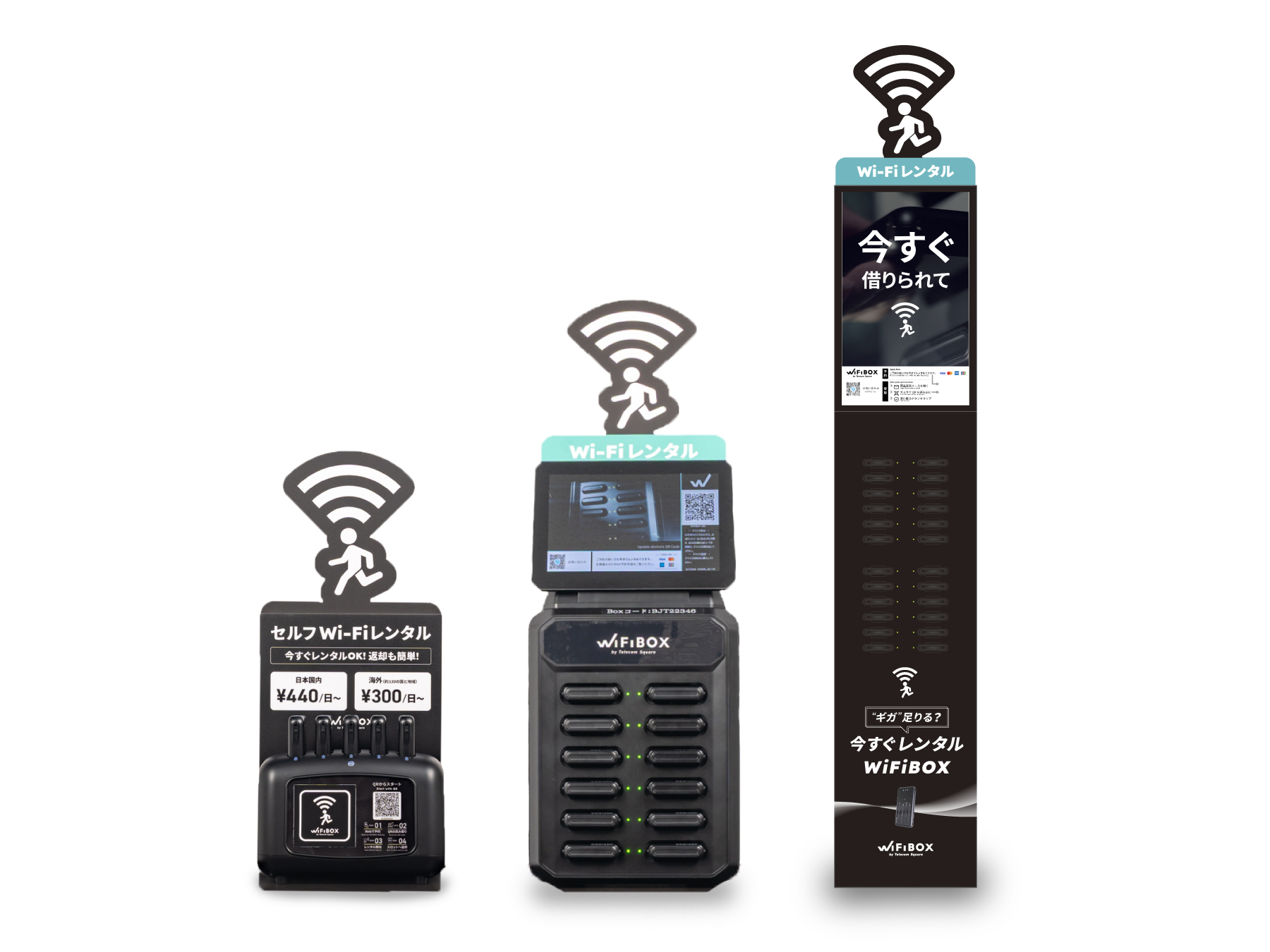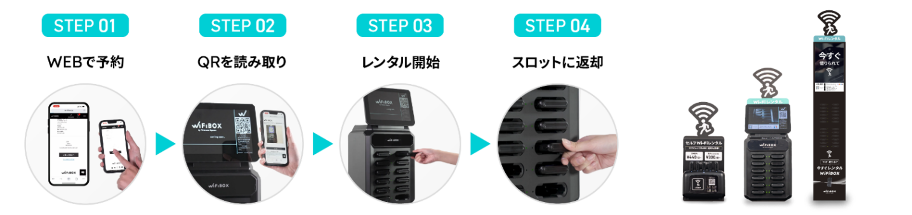 Web予約後、駅や空港などに設置しているボックスからWi-Fiルーターを引き抜くだけで簡単にレンタルできます。また、WiFiBOX貸出機が設置されている場所であれば受取場所と異なる場所での返却も可能です。