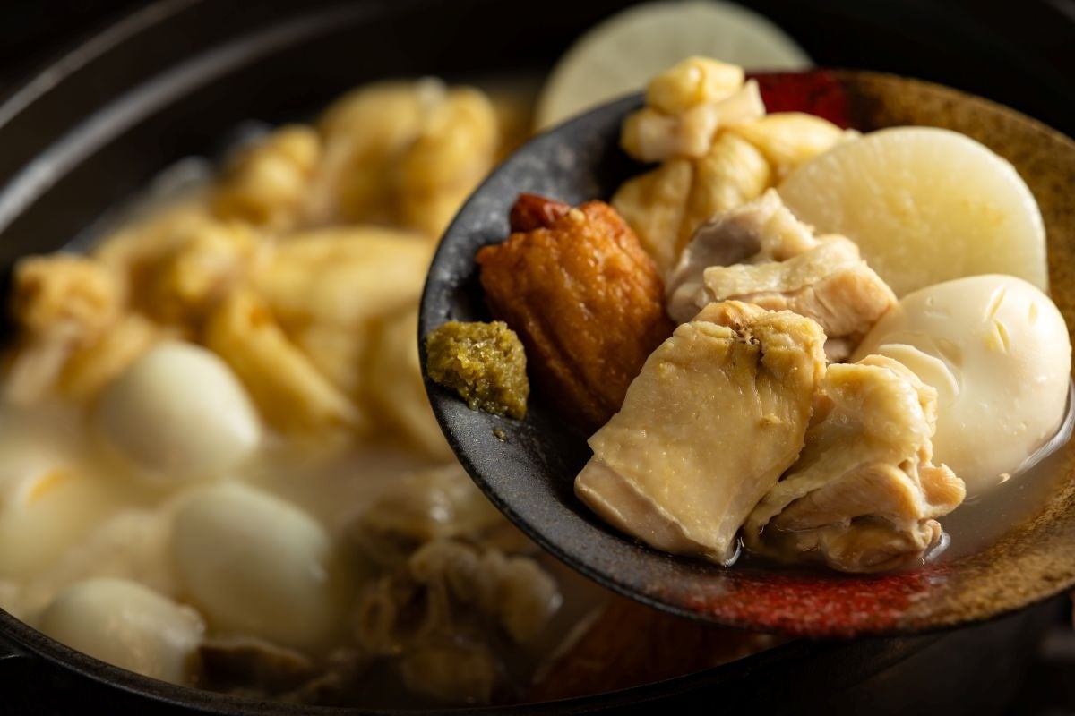 博多名物・水炊きの鶏スープをベースに、生姜を加えてじっくり煮込んだ旨みたっぷりのおでん。通常のおでんとは異なり、スープが鶏ベースの水炊きなので最後の一滴まで楽しめる“飲めるスープ”が特徴です。具材にもその旨みがしっかりと染み込んだ一品です。