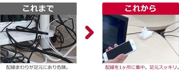 L字デスクを3台組み合わせると、配線に適したスペースが生まれます。延長コードを利用しスマートフォンやパソコンの充電器、LANケーブルを手元にのばせるため、机の下でコンセントを切り替える必要はありません。バラバラだった配線を1箇所に集中、デスク周りを整理することで足元のケーブルでの転倒防止にもつながります。