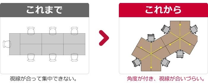 平机の場合、正面のスタッフと視線が合いやすく、モニターやラックで仕切りを作る必要がありました。しかし、120度の角度がついたL字型デスクでは互いの視線が合わないため、業務に集中することができます。