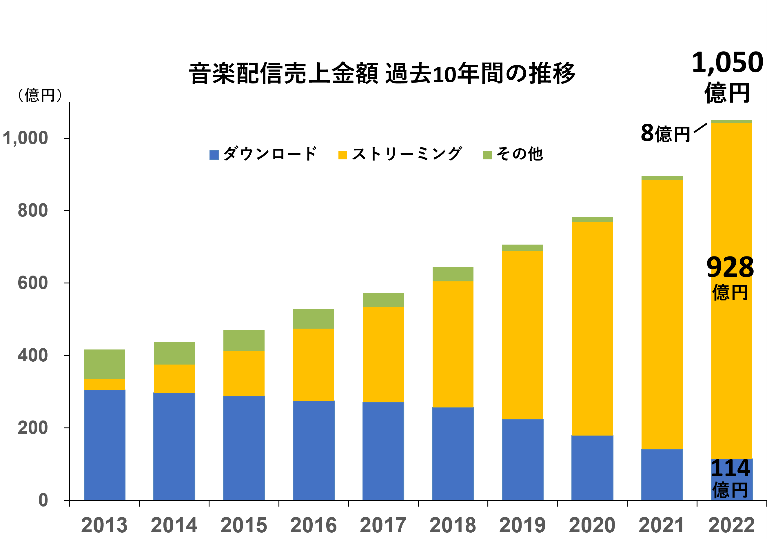 2022年年間の音楽配信売上は、1,050億円(対前年比117%)と2005年の統計開始以来最高額、初の1,000億円超えを達成し9年連続のプラス成長、5年連続の2桁増となりました。