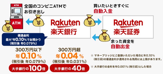 楽天銀行と楽天証券は、個人の資産形成・資産運用に関わるサービスの利便性向上を目的として、2011年4月から口座連携サービス「マネーブリッジ」の提供を開始しました。本サービスは、両社の口座をお持ちであればどなたでも無料でお申し込み可能で、設定が完了すると、両口座間資金の自動入出金(以下「スイープ」)機能などが利用できます。自動スイープによって、手数料無料で証券口座から銀行口座に資金を移すことが可能となり、「楽天銀行口座」に移された資金には大手銀行の100倍の優遇金利(※1)である預金金利が適用されます。このようなシームレスな取引環境やお得な特典などをご評価いただき、このたび、「マネーブリッジ」の預金残高5兆円を達成いたしました。
