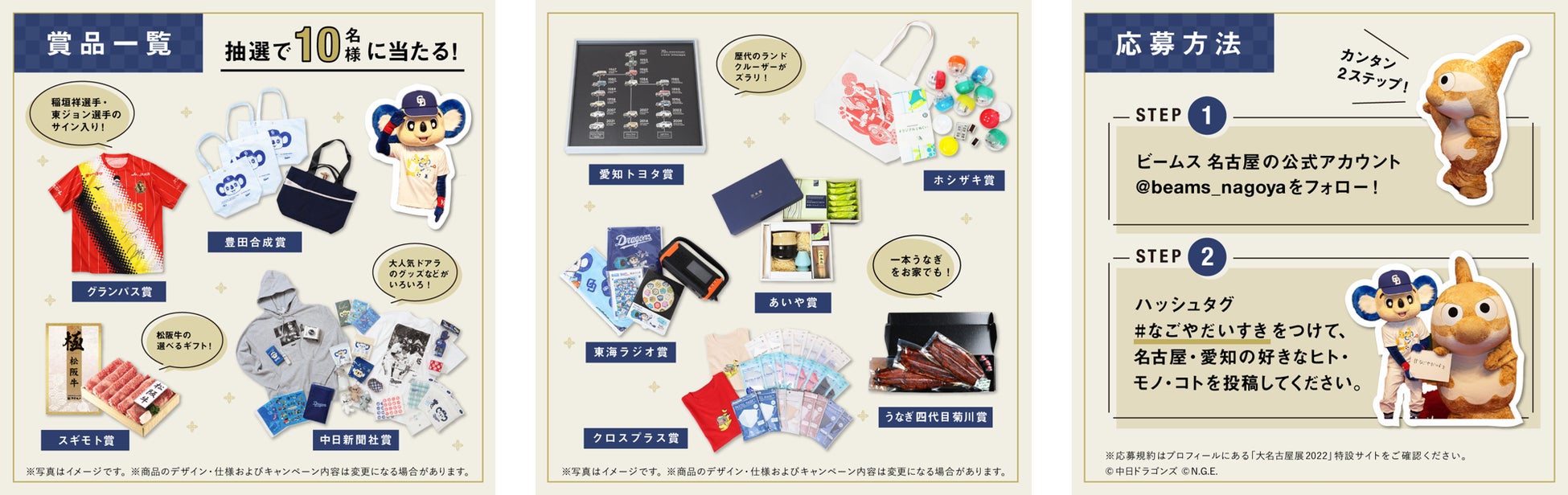 ビームス 名古屋のインスタグラムアカウント(@beams_nagoya)をフォローした上で、自分が好きな名古屋・愛知の「ヒト・モノ・コト」の写真や動画に「#なごやだいすき」を付けて投稿していただいた方の中から抽選で、大名古屋展に関連する賞品が当たるキャンペーンを実施します。