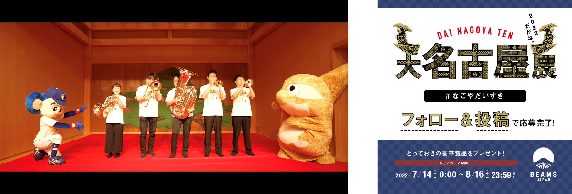 「大名古屋展2022」 の応援団として、名古屋グランパス公式マスコットの金鯱グランパスくんや中日ドラゴンズ公式マスコットのドアラ、そして、名古屋フィルハーモニー交響楽団 金管五重奏の皆さん、「ビームス 名古屋」のスタッフが登場しPR動画を盛り上げます。