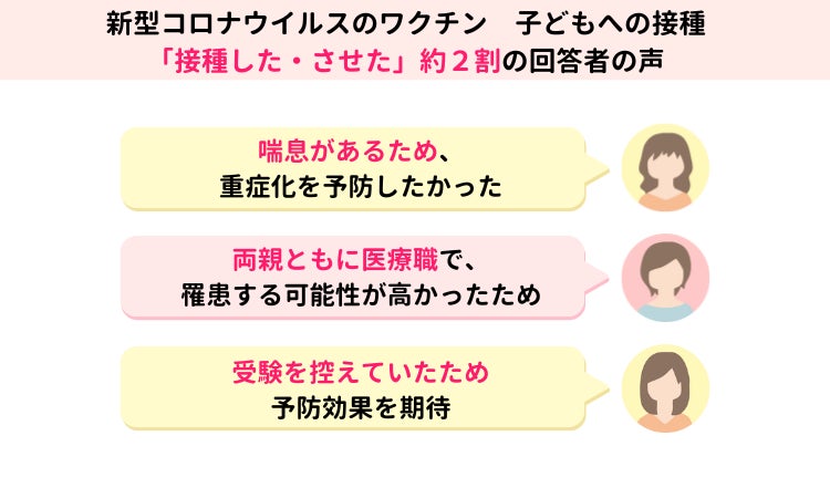 アンケート結果によると「接種した」と回答した人は全体の19.4%でした。主な理由としては「持病があるので重症化を防ぎたかった」などの“重症化予防”と「両親ともに医療職で罹患する可能性が高いため」という“親の仕事の都合により”といった声が寄せられました。