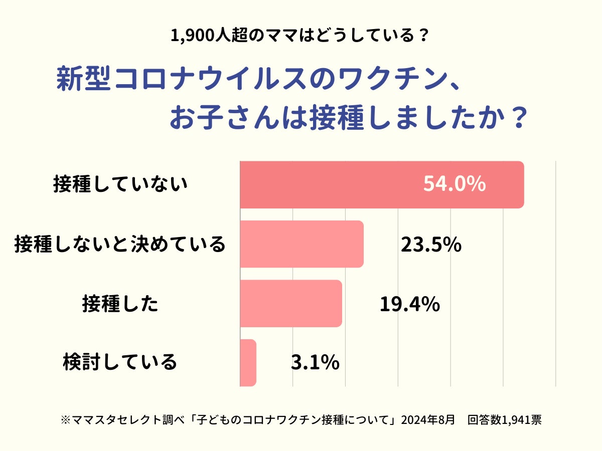 2024年4月以降、新型コロナワクチンの接種は努力義務や自治体からの推奨の規定はなくなりました(※)。これを受けてママスタセレクトでは「新型コロナウイルスのワクチンをお子さんは接種しましたか?」というアンケートを実施。選択肢に「接種した」「接種していない」「検討している」「接種しないと決めている」の4つを設定したところ、1,900人を超えるママたちから回答を得ることができました。