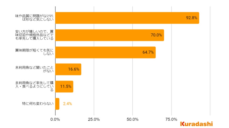 さらに、「値上げとともに、規格外品や訳あり品、未利用魚などが注目されているが、これらの購入についてどう思うか」という設問に対し、規格外品や訳あり品の購入については「味や品質に問題なければ形など気にしない」と回答した方が92.8%と最も多く、次いで「安い方が嬉しいので、賞味期限切迫や規格外品などを率先して購入している」と回答した方が70.0%となりました。