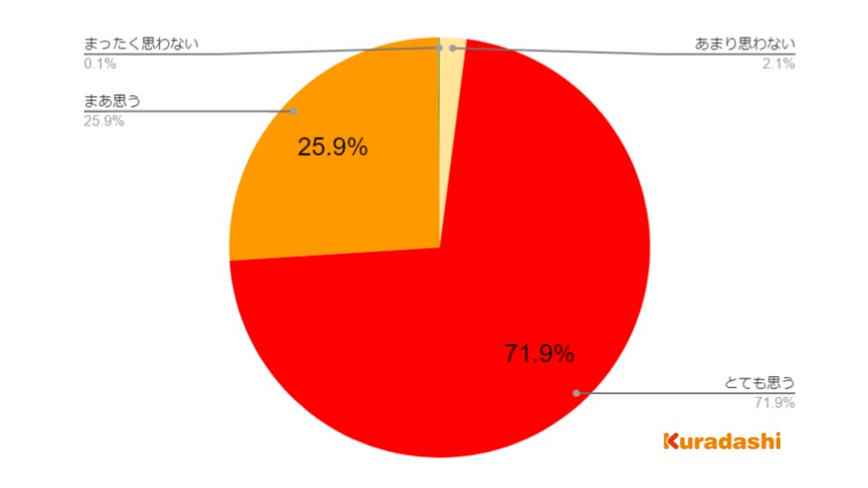 Kuradashiが10月に行ったユーザー調査(※4)によると、「値上げを受けてよりお得に商品を購入したい」という設問に対し、「とても思う」と回答した方が71.9%、「まあ思う」と回答した方が25.9%で、回答者全体の96.8%がよりお得に食品を購入したいと考えていることが読み取れます。