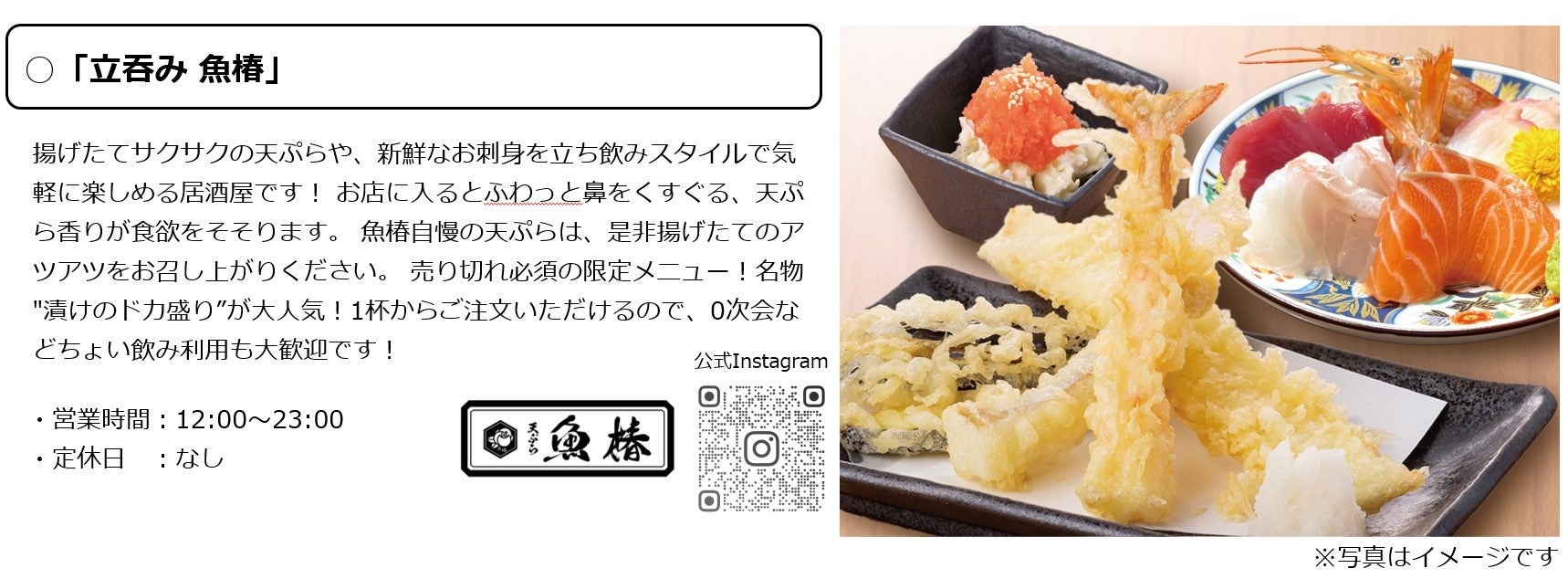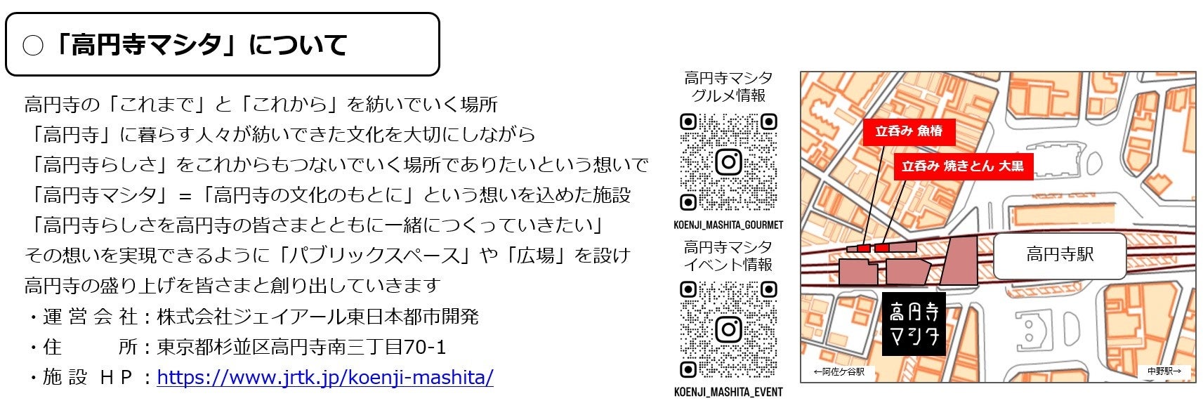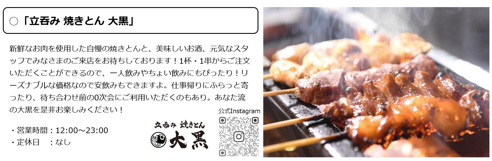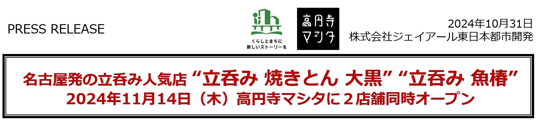 2024年11月14日(木)に、名古屋発の立ち呑み人気店「立呑み 焼きとん 大黒」と「立吞み 魚椿」が高円寺マシタに2店舗同時オープンします。大黒では自慢の焼きとんを、魚椿ではサクサクの天ぷらや新鮮なお刺身を提供します。2店とも気軽なちょい飲みから利用可能で、元気一杯のスタッフがお待ちしておりますのでぜひお楽しみください。