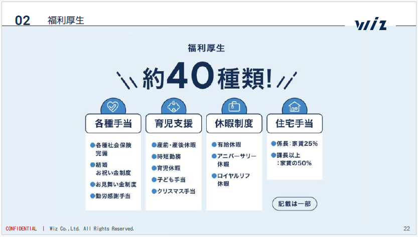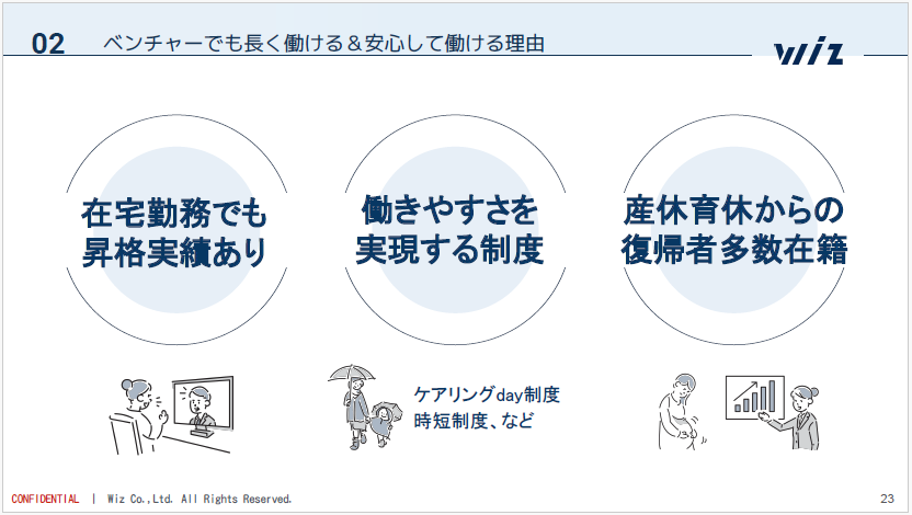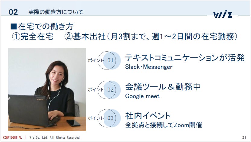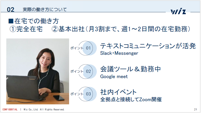 当日は、Wizの在宅勤務形態や、約40種類ある福利厚生、育児・介護中の社員を支える独自制度「ケアリングDAY」など、仕事と家庭の両立をサポートする職場環境について具体的にご説明させていただきました。