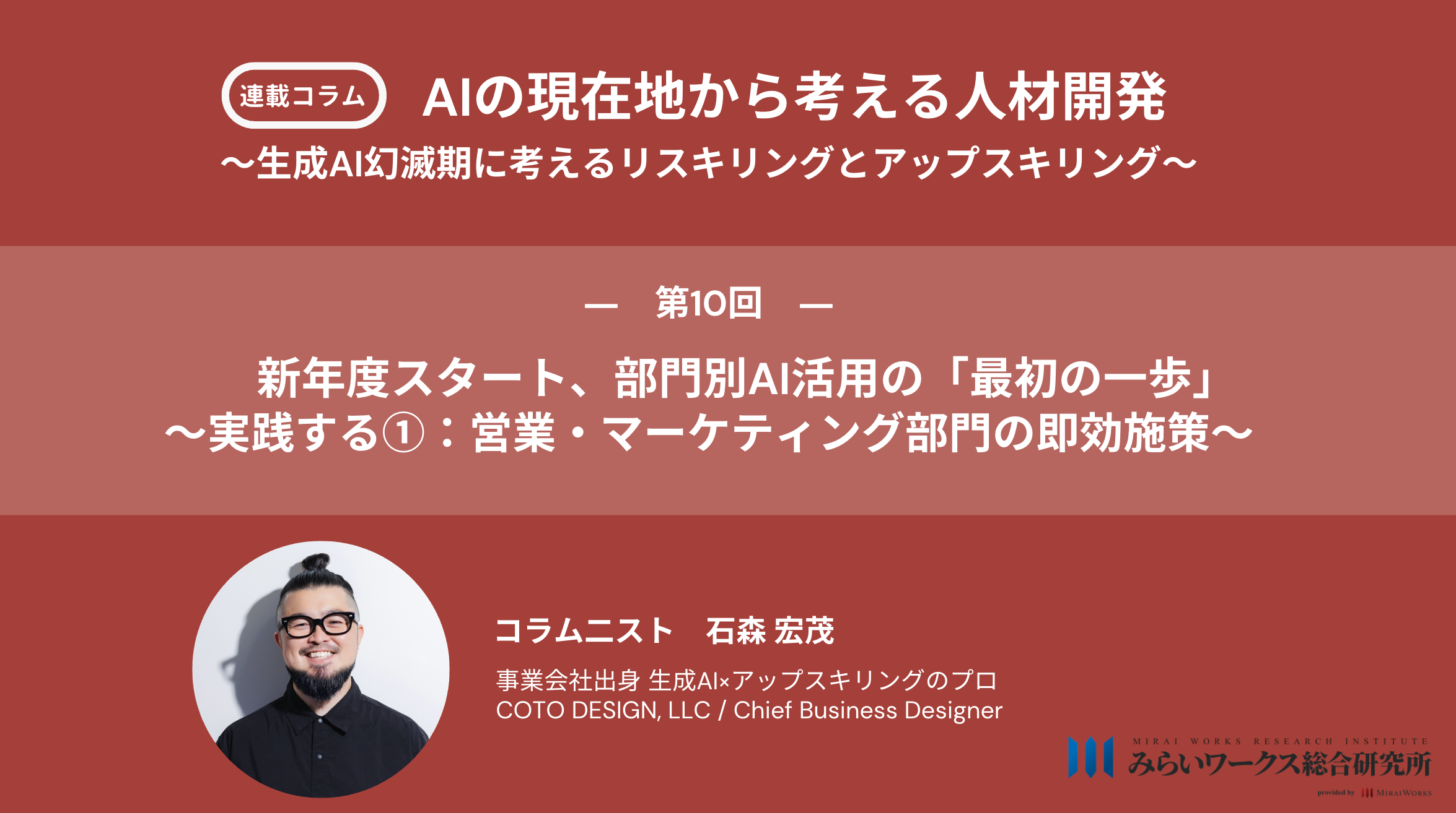 株式会社みらいワークス(本社:東京都港区、代表取締役社長 岡本 祥治、以下「当社」)が運営するみらいワークス総合研究所の企業向けメディア(https://mirai-works.co.jp/mwri/)において、連載中のコラム「AIの現在地から考える人材開発 〜生成AI幻滅期に考えるリスキリングとアップスキリング〜」が、2026年4月より第2フェーズである「Phase 2:実践展開期」を開始したことをお知らせします。